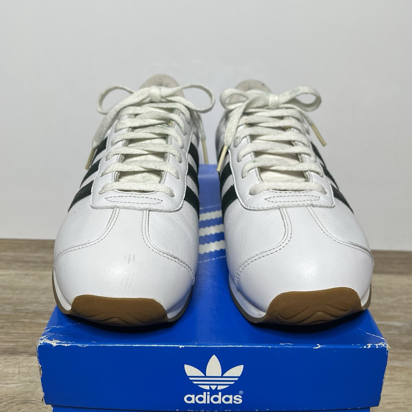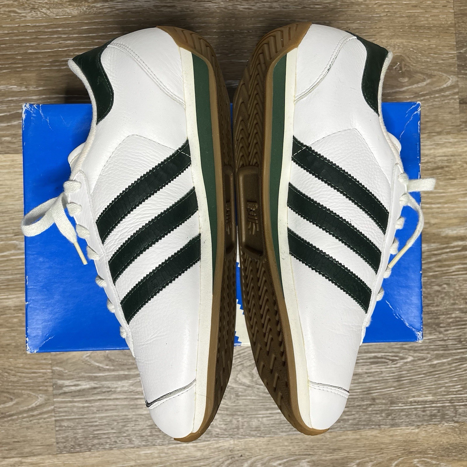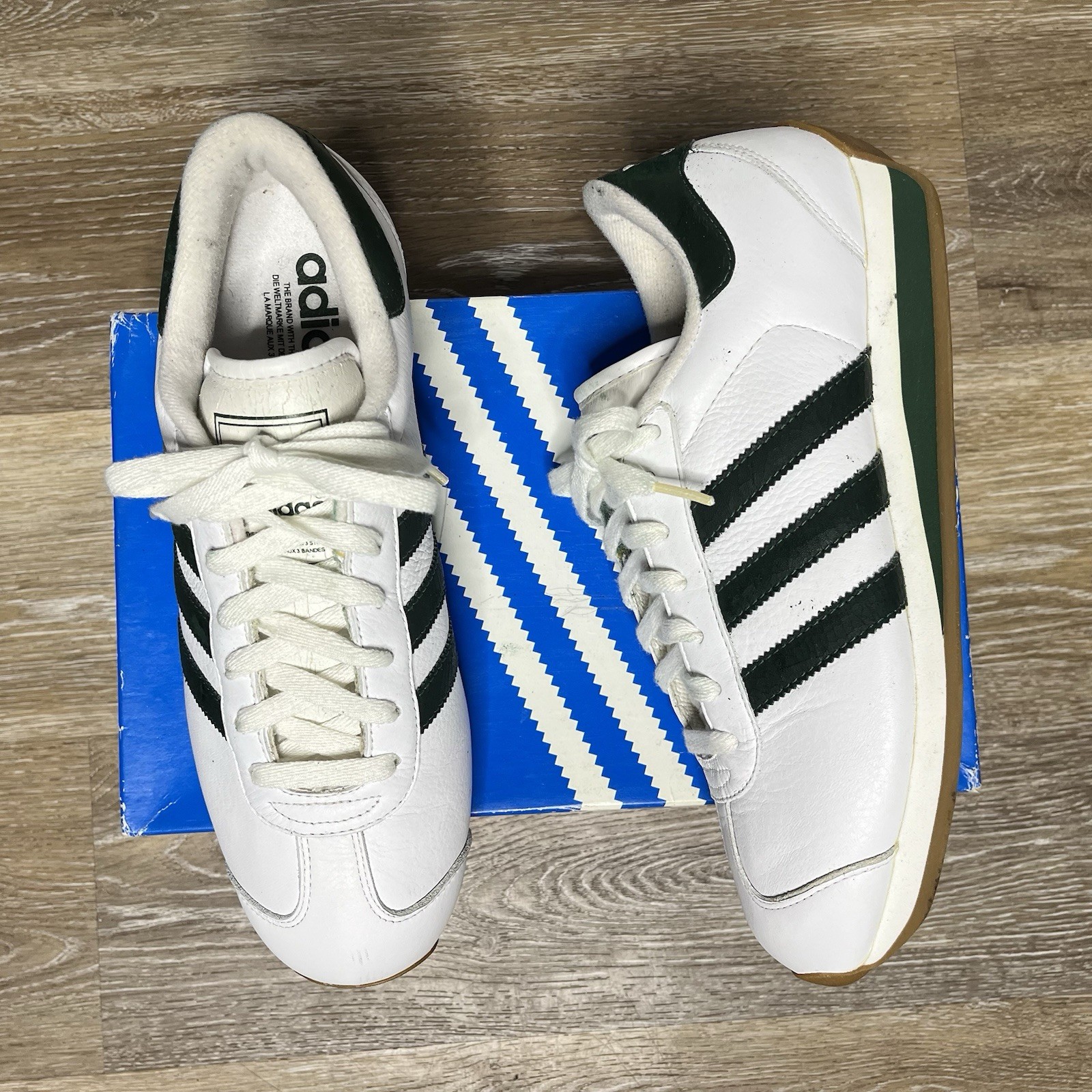 2003 adidas country 2 size 9 men/8.5 UK minimal wear but some flaws to aging green leather classic adidas trainers in green & white