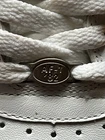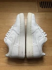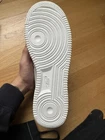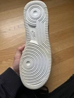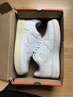 This is a pair of Nike Air Force 1 sneakers in white leather, released in 2004. They are men's athletic shoes in size 9, featuring the classic Nike design. The model is Nike Air Force 1, known for its style and comfort. These sneakers are not customized and are in new condition, with some slight scuffs on the bottom of the outsole from inside wear. Never worn outside. This is a 100% authentic pair from 2004, preserved in great condition. Other than the soles having some slight wear on the bottom, they are yellowed due to the age of the shoe. I do have the box in hand, but it is pretty badly damaged from age.