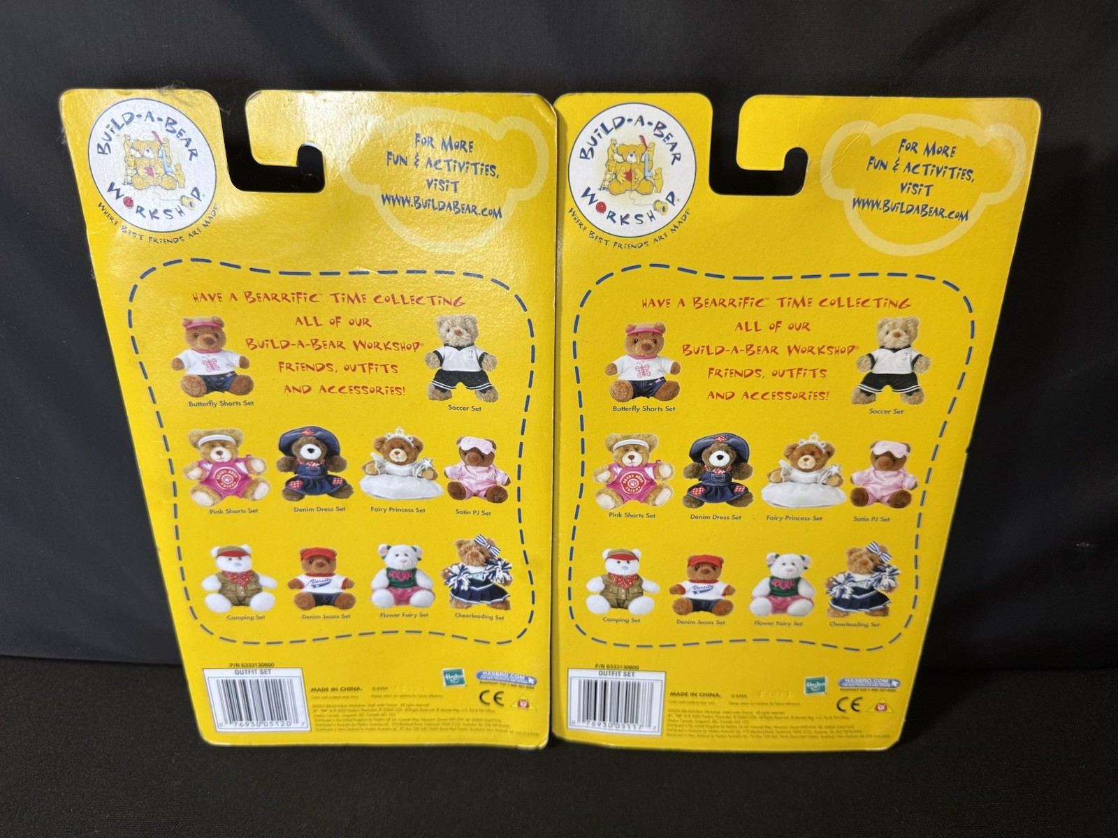 The product is a set of two vintage 2004 Build-A-Bear Workshop outfits, one in a cheerleader theme and the other a denim / gingham dres set. The clothing is designed for bears and is part of the Build-A-Bear franchise. These original outfits come sealed and are suitable for all occasions, perfect for dress-up play or special events like holidays or birthdays. Made in the 2000s, these outfits are a nostalgic addition to any teddy bear's wardrobe.