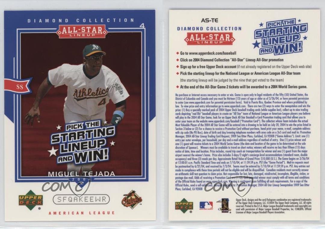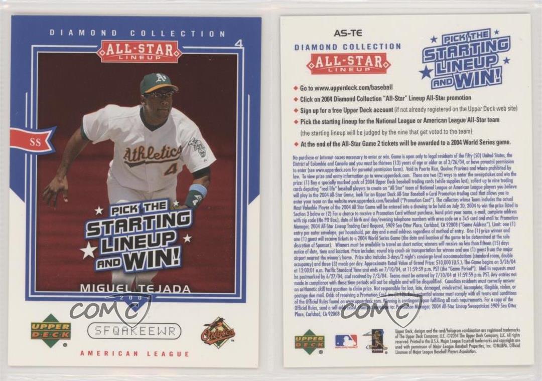 2004 Upper Deck Diamond Collection All-Star Lineup - Pick the Starting Lineups and Win! #AS-TE Miguel Tejada - Baseball Card - Featuring the Baltimore Orioles and Oakland Athletics - Featuring Miguel Tejada Search for more: 2004 Upper Deck Diamond Collection All-Star Lineup Search for more: 2004 Upper Deck Diamond Collection All-Star Lineup - Pick the Starting Lineups and Win! View all of our Listings Auctions Buy It Now About Us Located in the beautiful Pacific Northwest, COMC (Check Out My Cards) is the world's largest consignment service for trading card singles. More than 10,000 people have used our consignment service to list over 50 million trading cards. Find out how we can help you consign your items on eBay by contacting us through eBay messaging. COMC -- "The Safe & Easy Way to Buy & Sell" Representative Image - Select Specific Item above to see image of actual item Representative Image - Select Specific Item above to see image of actual item Raw Condition for Modern Cards Unless otherwise noted, raw modern cards are listed in Near Mint-Mint condition or better. A NM-MT card appears to be Mint at first glance, but upon closer inspection, may exhibit some of the following: minor print defects (e.g. roller marks, print line, dimple), minor scratches, slight edge wear, and slight corner wear. Centering is clearly visible in the images provided and does not factor into our condition assessment. Raw Condition for Vintage Cards Unless otherwise noted, raw vintage cards are listed in Excellent condition or better. An EX card may exhibit some of the following: minor rounding of corners, surface wear, print defects, light scratches, and slight edge wear/chipping. Centering is clearly visible in the images provided and does not factor into our condition assessment. Domestic Shipping Combined shipping for multiple items is available. To receive combined shipping, please ensure all desired items are in your eBay shopping cart before proceeding to checkout. eBay limits orders to 40 items per order. We automatically combine multiple orders placed on the same day. If you place multiple orders on the same day, please contact us to request a refund of applicable shipping costs. Signature confirmation may be required on invoices over $400. All cards are protected and shipped securely. International Shipping COMC offers eBay's International Shipping (EIS) for international orders under $2,500* (see country exceptions below). All duties and import fees are paid at checkout; in the rare event that there are additional import fees upon delivery, these are borne by the buyer. EIS packages route through a shipping hub in Erlanger, KY before shipping to their final destination. Please note that EIS does not allow for combined shipments. The shipping rates are determined by eBay and cannot be adjusted. *Maximum sale price exceptions: Colombia, Kuwait ($2,000); Taiwan ($1,539); Chile, Costa Rica, Guatemala, Honduras, Trinidad and Tobago ($1,000); Antigua and Barbuda, Aruba, Belize, Dominica, Grenada, Philippines, Saint Kitts and Nevis, Saint Lucia, Montserrat, Turks and Caicos Islands ($500); Dominican Republic, El Salvador ($200). Please request a shipping quote through eBay messaging for orders that exceed the maximum sale price supported by eBay's International Shipping. You will be responsible for all duties and import fees for international orders shipped outside the EIS. All cards are protected and shipped securely. Payment COMC does not accept offers on our cards through our eBay storefront. COMC utilizes eBay’s managed payments system. If you are experiencing difficulties making a payment, please contact eBay for assistance. Return Policy Returns are only accepted on the rare occasion the item is not as described. If you are making a return, please initiate the return process through eBay so a mailing label can be provided for you. Prior to listing, our expert team carefully assessed this item to represent it accurately. Please review the description and high-definition images prior to purchasing to ensure this item meets your satisfaction. We welcome you to contact us if you have further questions about this item. Trust and Integrity COMC carefully assesses each item consigned to us to prevent fraudulent items from entering the marketplace. If you believe an item offered on COMC may be fraudulent, please contact us with details so we can investigate the issue. Items we determine are outside our supported items policy may be removed. Last Modified: 6/25/2025 1:24:28 PM PDT