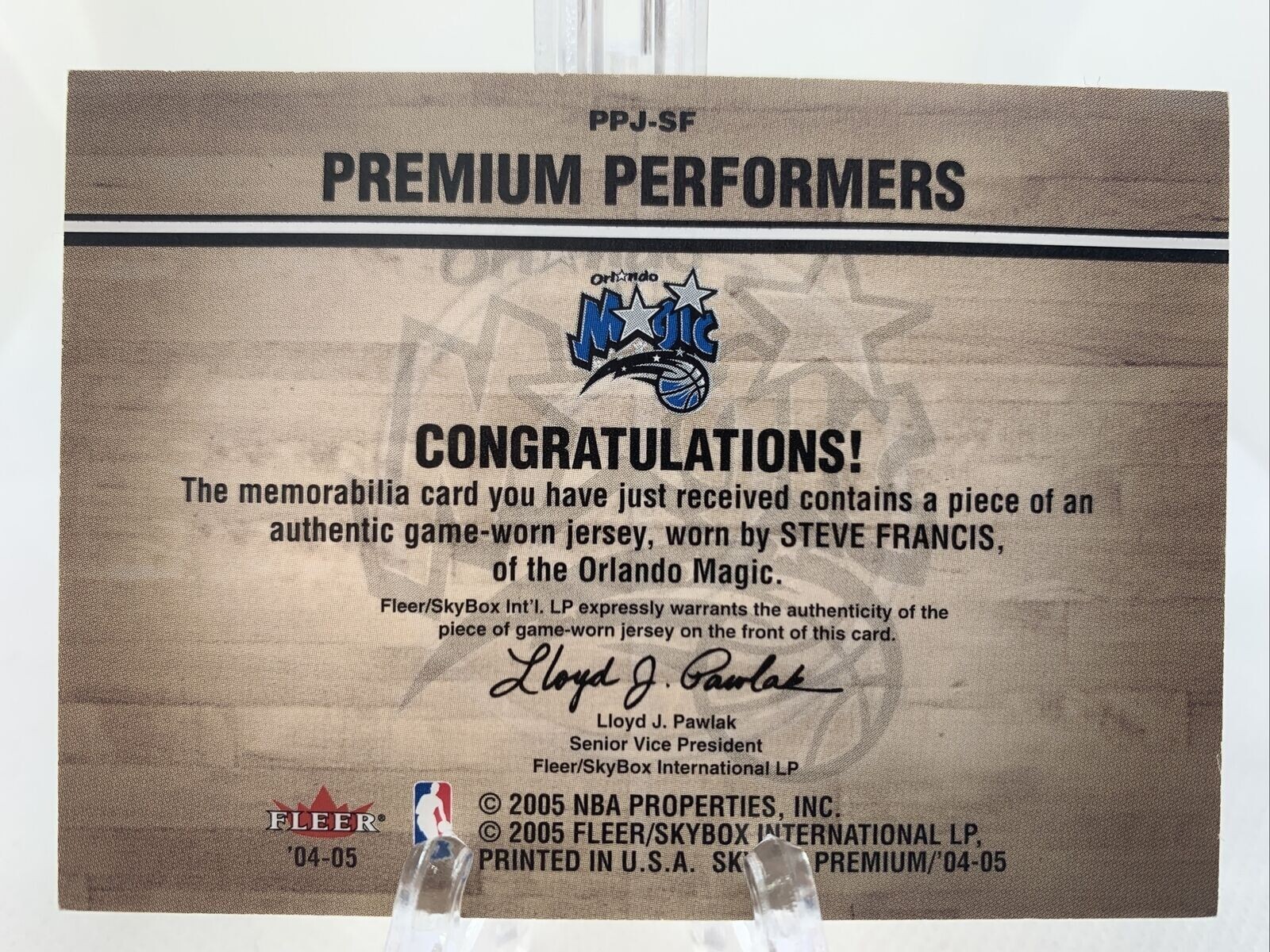 This card is a must-have for any collector! The design is sleek, the jersey swatch adds a cool touch, and Steve Francis was a beast back in the day. Great condition and a solid addition to my collection—highly recommend grabbing one if you can!