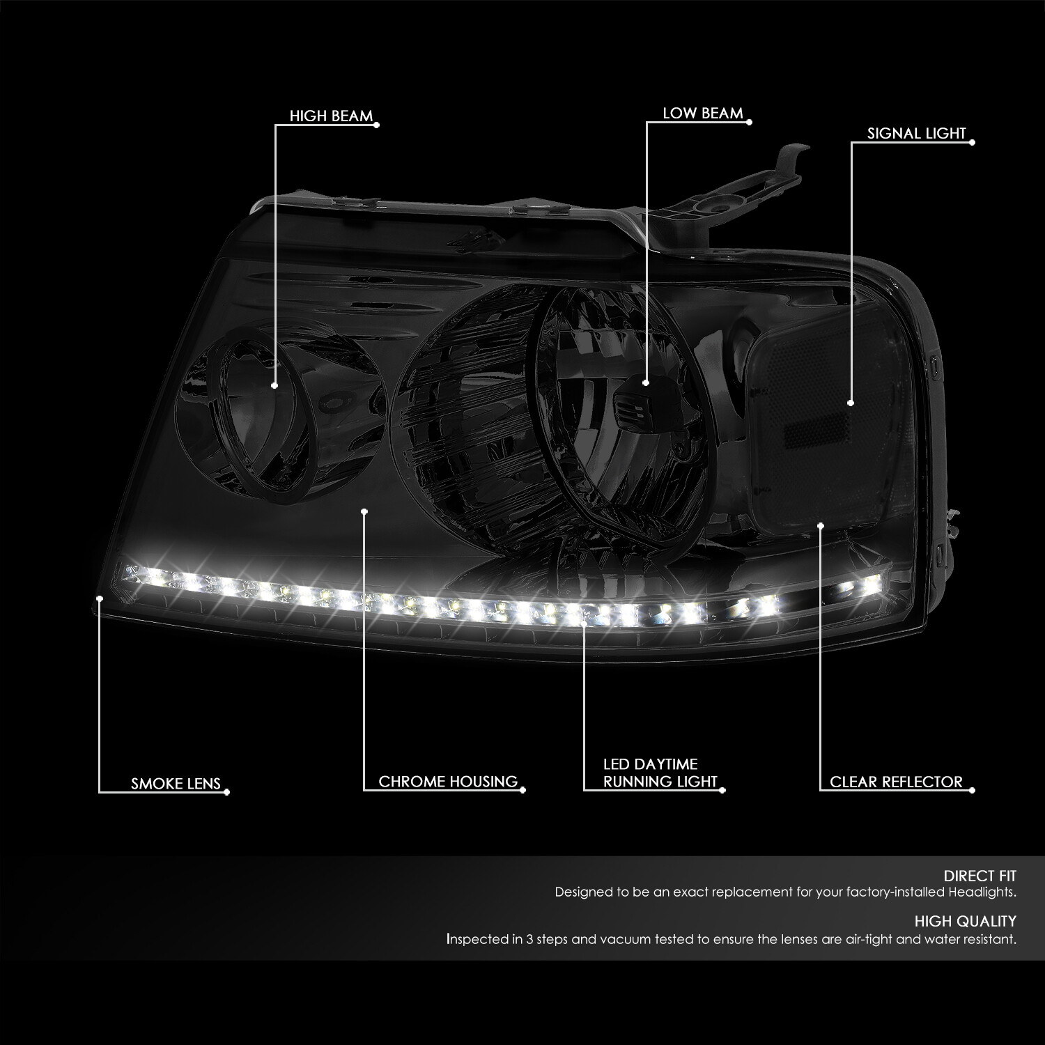 Welcome to our eBay store DPT Motorsport Business Hours: Monday - Friday, 9 AM to 6 PM PST. Store Home Payment Shipping Returns Need Help Add to Favorites About Us Fit 04-08 Ford F150 Lincoln Mark LT Chrome Housing Smoked Lens LED DRL Headlight Product Description A headlight (headlamp) is a lamp attached to the front of a vehicle to light the road ahead. Headlight performance has steadily improved throughout the automobile age, spurred by the great disparity between daytime and nighttime traffic fatalities. Headlights are one of the most important components of your vehicle; they allow you to see the road in front of you clearly during the night and in any bad weather that may arise. Our headlights upgrade the face of your vehicle with clear style and extreme range. Make of High-Grade Durable ABS Plastic Materials Smoked Lens with Chrome Housing Sold as a Pair (Driver & Passenger Side) Direct Bolt-on Replacement for The Stock Unit Easy Installation without Drilling Needed Improves Visibility and Driving Safety in Hazy Weather Built-in White LED DRL (Daytime Running Light) LED Light Bar Running Light will Require Wiring into Vehicles Existing Wiring Harness Includes: 1 X Pair of Headlights (Left & Right) Notes: Compatible with: 04-08 Ford F-150 06-08 Lincoln Mark LT 100% Brand New Professional Installation is Highly Recommended Installation Instruction is NOT Included About Us Payment Shipping Returns Feedback Contact Us Have any questions or need info about something you already purchased? We'd love to hear from you! For items already purchased, please kindly include your eBay item number for faster response time. DPT Motorsport operates from Monday through Friday, 10 am to 6 pm (PST). ATTENTION: We are closed on Saturdays and Sundays. All messages will be replied in the order it was received during business days Thank you for choosing DPT Motorsport and happy bidding! We accept PayPal only. We reserve the right to file Non-Paying Bidder if payment is not received 10 days after the auction ended. Shipping Methods All shipments are made via either UPS or United States Postal Service depending on the types of products purchased. Majority of our orders will be ship within 2 business days (mostly within 24hrs) (All mail transit time stated above is best estimated but not guaranteed.) All shipments requires physical addresses, no PO Box address will be shipped. Shipping and handling charges are not negotiable. Return Policy **We stand behind the products we sell. If for any reason you are not satisfied with your purchase, we'll be happy to process a refund the product less S&H within 30 Days of your purchase. All return items will require a RMA number, which is given by our Customer Service Department only. Please allow 10-14 days for returns and exchange to be process. Please inspect all your order(s) upon receipt. All return items MUST be in brand new condition which means the item is never installed and kept in the original packaging. We will not reship replacement(s) before we get a claim approval for the lost or stolen item(s) or the returned item from customers. In most cases, all shipping and handling fees are non-refundable, unless it has been approved by our Customer Service Department. Any item(s) that the buyer states as defective will be tested by our Returns Department, if there is no problems or errors found during testing. Once the RMA# is issued, the buyer will have 30 days to return the item, if any items that is return after 30 days, the item(s) are subject for rejection. All items are brand new unless otherwise stated. PROFESSIONAL installation is highly recommended. Buyer assumes all risk on usage. About Us Have any questions or need info about something you already purchased? We'd love to hear from you! For items already purchased, please kindly include your eBay item number for faster response time. DPT Motorsport operates from Monday through Friday, 10 am to 6 pm (PST). ATTENTION: We are closed on Saturdays and Sundays. All messages will be replied in the order it was received during business days Thank you for choosing DPT Motorsport and happy bidding! Payment We accept PayPal only. We reserve the right to file Non-Paying Bidder if payment is not received 10 days after the auction ended. Shipping Shipping Methods All shipments are made via either UPS or United States Postal Service depending on the types of products purchased. Majority of our orders will be ship within 2 business days (mostly within 24hrs) (All mail transit time stated above is best estimated but not guaranteed.) All shipments requires physical addresses, no PO Box address will be shipped. Shipping and handling charges are not negotiable. Returns >Return Policy **We stand behind the products we sell. If for any reason you are not satisfied with your purchase, we'll be happy to process an exchange or refund the product less S&H within 30 Days of your purchase. All return items will require a RMA number, which is given by our Customer Service Department only. Please allow 10-14 days for returns and exchange to be process. Please inspect all your order(s) upon receipt. All return items MUST be in brand new condition which means the item is never installed and kept in the original packaging, otherwise you will be subjected to a 20% restocking fee. We will not reship replacement(s) before we get a claim approval for the lost or stolen item(s) or the returned item from customers. In most cases, all shipping and handling fees are non-refundable, unless it has been approved by our Customer Service Department. Any item(s) that the buyer states as defective will be tested by our Returns Department, if there is no problems or errors found during testing, there will be a mandatory 20% restocking fee for the price of the item. Once the RMA# is issued, the buyer will have 30 days to return the item, if any items that is return after 30 days, the item(s) are subject for rejection. If the items are returned without a