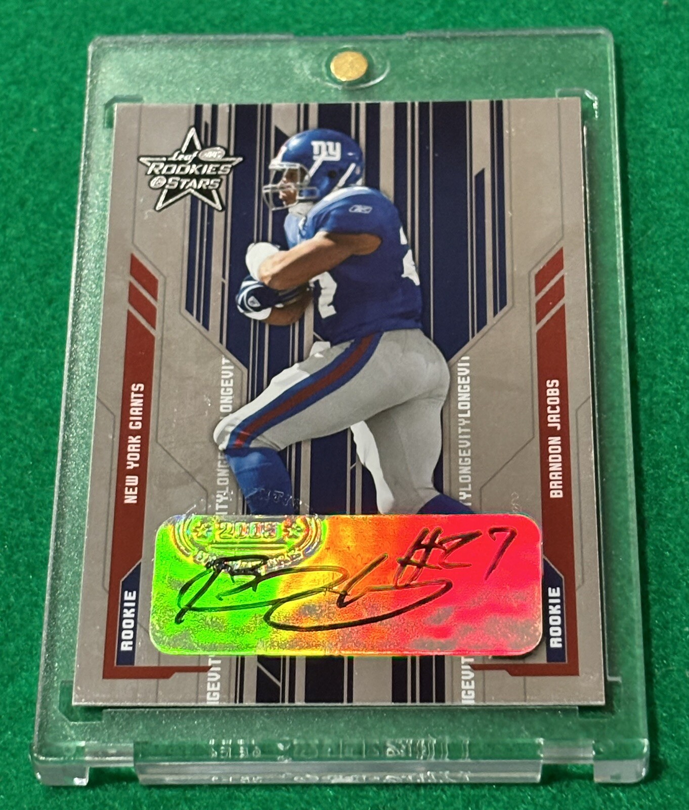 THIS LISTING IS FOR A 2005 LEAF ROOKIES AND STARS BRANDON JACOBS ROOKIE AUTOGRAPH ROOKIE CARD JERSEY NUMBER SP STAMPED 27 of 50 . A SUPER RARE AND UNIQUE ONE OF ONE ROOKIE AUTOGRAPH OF THE NY GIANTS ALL TIME RUSHING TOUCHDOWNS LEADER BRANDON JACOBS. SUPER FAST SAME DAY USPS SHIPPING WITH TRACKING AND DELIVERY CONFIRMATION WILL BE $4.95 BE SURE TO CHECK OUT OUR OTHER CARDS WE HAVE FOR SALE RIGHT NOW. THANK YOU.