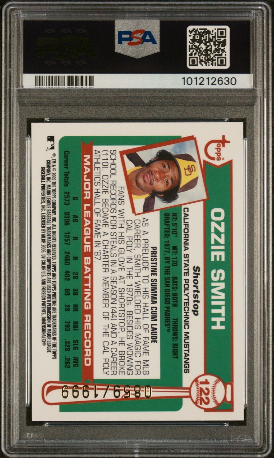 2005 Topps Pristine Legends #122 Ozzie Smith 0859/1999 - PSA 9 2005 Topps Pristine Legends #122 Ozzie Smith. This card has been graded by PSA MINT 9.. This card is #*d 0859/1999. JHF Collectibles specializes in Sports collectibles and autographs. We feature trading cards graded by PSA and BGS. We also feature autographs that have been authenticated by BAS (Beckett Authentication Service), PSA DNA, JSA and Steiner. We hope we can help you to enhance your collection. Please contact us through Ebay if you have any questions. You may be interested in our other eBay listings . Powered by SixBit's eCommerce Solution