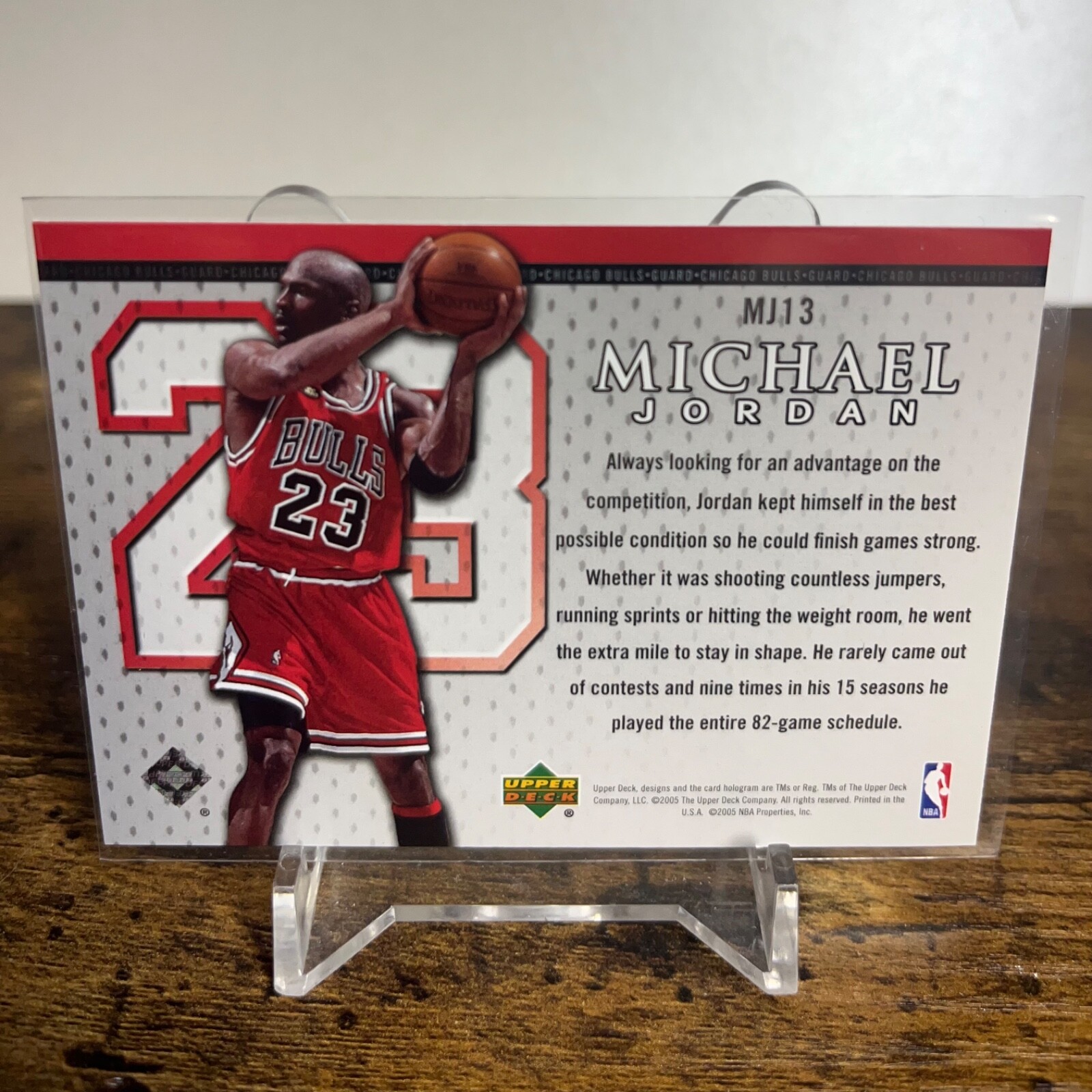 The product is a 2005-06 Upper Deck Michael Jordan trading card featuring the basketball legend from the Chicago Bulls. This sports trading card is part of the Michael Jordan insert set within the 2005-06 Upper Deck collection. The card showcases Jordan during his time with the Bulls in the NBA, making it a sought-after collectible for fans and collectors of sports memorabilia. With a unique card number and variety, this item is a valuable addition to any basketball card collection.
