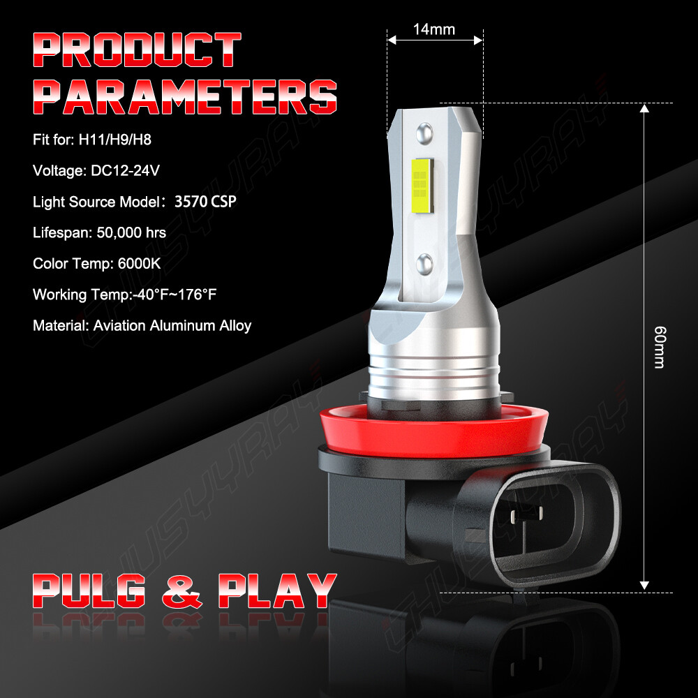 Specification: Plug Type: H11+H9+H8,High low Beam +Fog Light Power(per set): 100W/Set LED Quantity(each bulb): 6pcs* LED chips Luminous Flux: 20000lmt(10000lmlb) Operating Voltage: DC 9-32V(fit 12V,24V vehicles) Color Temperature: Pure White 6500K Waterproof rate: IP68 rated water and dust seal Lifespan: Over 50000hrs lifetime Beam Angle: 270 degree@low beam,360 degree@high beam Material: Aviation 6063 aluminum profile Operating Temperature: -20-80 degree Celsius Usage: headlight+fog light (6pcs) H11 LED Hi-Lo Beam +fog Light LED headlight + Fog Light conversion kit Latest LED chip(USA) light source,2 luminous faces no blind zone 500% brighter than original halogen bulbs Soft White light in solid beam pattern, will not dazzle on-coming traffic. Xenon white light reflect road paint/signs better to show clearer road situation during night driving 270 degree low beam angle with cut-off line,will not dazzle oncoming traffic All-in one heat conduction+high speed mute fan system keep the light bulb in appropriate working temperature Built-in constant current CPU, instant full brightness without start-up relay 500% BRIGHTER THAN HALOGENS: The H11 H9 H8 led headlight + Fog Light provide up to 500% more light with a 6000K cool white clearer color. This is 6 times brighter than your original halogen bulb. PERFECT BEAM PATTERN: The ultra thin design makes the chips of our H11 H9 H8 led bulb much closer for a Super-Focused beam, delivering wider angle and farther range light on the road. No glare to oncoming traffic, and no dark spots ensure a safer drive. Easy To Install Almost 1:1 mini design as halogen, easy to install in 10 minutes without any modification. Two-way heat dissipation channel Package Included: 2x H11 LED Headlight High Beam Bulbs 2x H9 LED Headlight Low Beam Bulbs 2x H8 Fog Light Bulbs On Jun 24, 2025 at 22:19:22 PDT, seller added the following information: