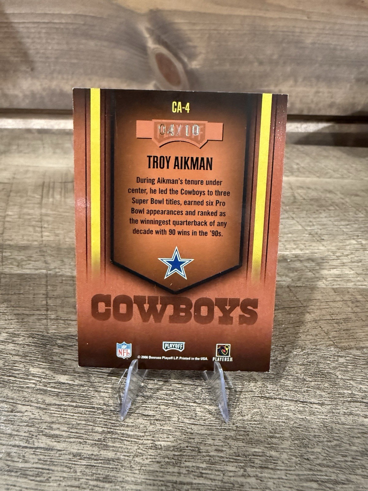 Own a piece of football history with this rare 2006 Troy Aikman Auto Canton Absolute Playoff card. With a print run of just 04/10, this card is a must-have for any serious collector. Featuring the legendary Dallas Cowboys quarterback and Hall of Famer, this card is a true gem. The card is in great shape and comes from a smoke-free home. Don't miss out on this opportunity to own a piece of football history.