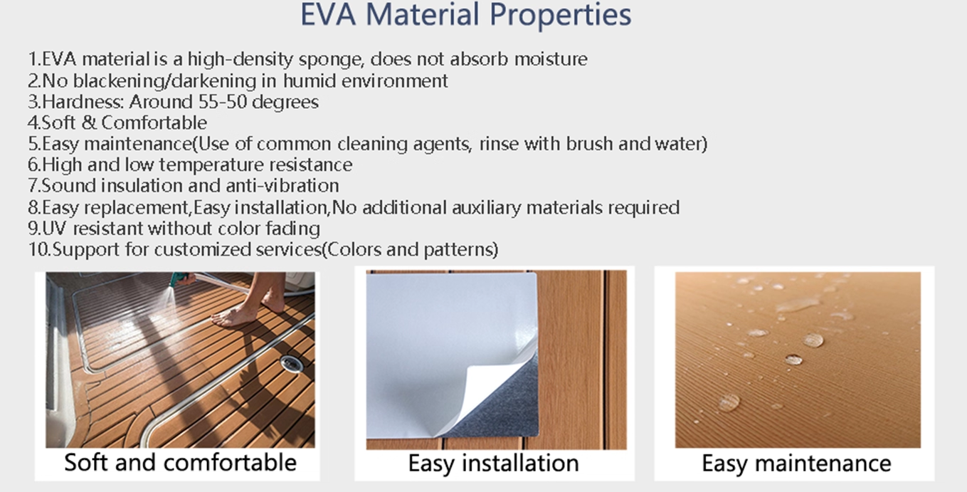 We could not add the 16 floor color options that you can choose to use to each listing because of quantity limit, when you order it, you can just leave an order note for the floor color that you want to use or you can send us a message, we will always check and confirm the floor color with you before we make the floor for you.You can just order it. Please be aware that we can only make this boat floor by the first listing drawing. Before you order it, please double check the listing drawing outline shapes with your boat to make sure they can fit your boat well. As long as the floor pad outline shape can match your boat deck layout, it should fit well.We will not be hold responsible if the listing drawing floors do not fit your boat well because you do not double check our listing drawing. We can only make sure that the floors will be cut exactly by the listing drawing. If you are not sure if the drawing can fit well with your boat, please send us some photos of your boat deck layout or a short video to show your boat deck layout from stern to bow so we can help you to confirm the fitting. The floor comes with marine backing adhesive.It is peel and stick installation.You just need to peel off the white protection paper and put it down. You do not need to buy glue to install it. We offer 1 year warranty for all our boat floors. The EVA floor is 1/4″(6mm) thick two-color pad. You can choose your colors, texture and faux teak option. Additional custom text logos can also be incorporated on EVA floor. All routed logos and beveled edges will show the bottom color selected. All EVA floors come with marine backing glue. All EVA floors listed on our online store are “made to order” and not stocked so please allow up to 2-3 weeks for delivery. EVA floor fabrication time is about 4-5 days, then it will take about 7-10 days’ time to ship and deliver to your order shipping address.After you order it, please double check your order shipping address to make sure all the shipping address, postal code, city name and contact phone number are all correct. We will ship all orders by express shipping such as DHL, FedEX, USP or EMS express. We will choose the shipping courier as we see fit. Color choices: #1 Black over Brown #2 Black over Dark Grey #3 Black over Green #4 Black over Red #5 Black over White #6 Brown over Black #7 Brown over White #8 Coffee over Black #9 Dark Grey over Black #10 Dark Grey over Grey #11 Grey over Black #12 Grey over blue #13 Grey over Purple #14 Grey over Red #15 Grey over White #16 Black over Blue When you order it, please tell us the color you want for top layer and bottom layer. Additional custom text logo fee:50 USD/ea. Before you order it, please verify floor drawing and confirm that it matches your boat and understand that this cannot be returned without a restocking fee of 30%. We can also make the custom EVA teak decking by the template drawing or full size template that you can supply to us. The listing price does not include any destination duties/taxes/custom fees/etc. that will be due when the product arrives at destination countries/regions. It is the customer’s responsibility to pay for all custom duty/taxes/custom fees if any. 1.EVA material is a high-density sponge, does not absorb moisture 2.No blackening/darkening in humid environment 3.Hardness: Around 55-50 degrees 4.Soft & Comfortable 5.Easy maintenance(Use of common cleaning agents, rinse with brush and water 6.High and low temperature resistance 7.Sound insulation and anti-vibration 8.Easy replacement,Easy installation,No additional auxiliary materials required 9.UV resistant without color fading 10.Support for customized services(Colors and patterns) Precautions before payment: 1.Please check if the boat model match your Yacht model。 2.Some ship models have different configurations with different options, please pay attention to choose the most suitable one 3.If not sure whether your ship matches the drawings, please send us photos of swim platform and cockpit, we could help to determine if it is appropriate 4..If need to verify the size, please feel free to contact us Order colors: 1.If request color not included in color cards, need to waiting the other 10-15 days. Parcels can be sent out within 20 days(Start from the moment of payment done), extend the cycle when it comes to holidays 2.The picture colors for reference only, based on actual color(Photos taken by cell phones easy to present the chromatic aberration) For design: 1.We could design drawings according to the customer’s requirements(Free of Charge) 2.We could provide design drawings for your choices 3.Support LOGO customization(50USD/ea), document is needed, format file: DXF/AI/PDF/JPJ/PNG etc. For Installation: 1.Need to use acetone or alcohol to clean the floor before installation(To remove surface wax of new ships), make sure it is dry before starting the installation. 2.Lay all EVA floors flat before installation. When confirming the location, tear off the backing adhesive from one corner and start the installation 3.Fix it when pasting, cannot move EVA floors 4.Rolling with round rollers during installation process(Need to finger press LOGO position in advance to avoid air in it). If air generated, remove it by use of a small needle to pierce the air bubble 5.No soaking within 48 hours after installation Making Templates: If no matching ship model in our sale list, pls provide template we could produce it based on your template’s requirement Reference image to create template Make a note in the package to remark contact details, name, the brand of small ship/model/year of production, we will contact you immediately We will send design drawings to you for confirmation within 5 days after template received Complete production and send package within 3-5 days after confirmation of drawings(after payment done) Package: Soft material. Rolled and packed for shipment. Outer box package Shipment Express courier: DHL FEDEX TNT UPS 