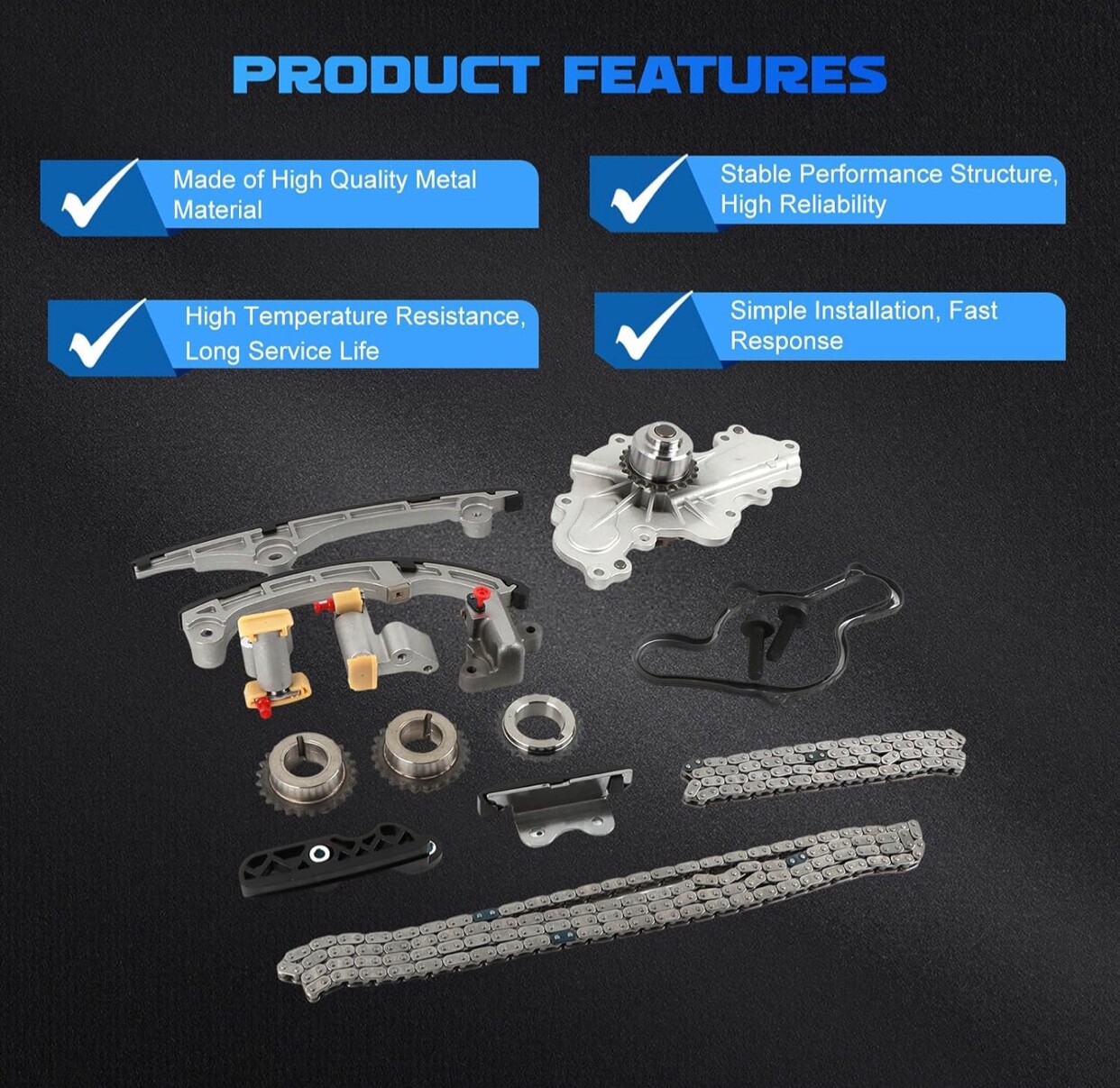 #1144 Engine Timing Chain Kit Timing Chain Kit Fits for 2007-2011 Flex Taurus MKS MKT 6 CX-9 Edge Fusion MKX MKZ Taurus X Sable 3.5L 3.7L Replace# AT4Z-6306-A 7T4Z-6256-A 7T4Z-6268-CA 🚘 PART NUMBER: AT4Z-6306-A Engine Timing Chain Kit with Water Pump fits for AT4Z-6306-A, 7T4Z-6256-A, 7T4Z-6268-CA, AT4Z-6268-C, 7T4Z-6K254-BA, 7T4Z-6K254-AA, BA5Z-6L266-B, BA5Z-6K255-A, BA5Z-6B274-A, AT4Z-6K297-A, AT4Z-6K297-B.The performance results of the accessories will be up to the standard of the original packaging. 🚘 COMPATIBLE WITH:AT4Z-6306-A Engine Timing Chain Kit with Water Pump compatible with 2009-2011 6 3.7L 丨 with 2010 Fusion 3.5L 丨 with 2009-2011 MKS 3.5L 3.7L 丨 with 2010-2011 MKT 3.5L 3.7L 丨 with 2007-2010 MKX 3.5L 丨 with 2007-2010 MKZ 3.5L 丨 with 2009-2011 Flex 3.5L 丨 with 2008-2011 CX-9 3.7L 丨 with 2007-2010 Edge 3.5L 丨 with 2008-2009 Sable 3.5L 丨 with 2008-2011 Taurus 3.5L.For specific year models, please see the detailed description of the applicable model 🚘 PACKAGE INCLUDING: 1 Timing Chain (primary lower 202 links) 丨 1 Timing Chain upper (cam to cam 2 req) 丨 1 Tensioner primary (lower tensioner) 丨 1 Tensioner right (RH upper chain tensioner) 丨 1 Tensioner left (LH upper chain tensioner) 丨 4 Guide Rail ( righ*2 & left *2 )丨 1 Cam Sprocket intake (right actuator) - not included 丨 1 Cam Sprocket intake (left, except Taurus) - not included 丨 2 Cam Sprocket exhaust (25 teeth 2 req.) 丨 1 Crank Sprocket (23 teeth) 丨 1 GMB Water Pump w/ Gasket 🚘 WARM TIPS: Before purchasing, please check your car model and check the following fitment details information.