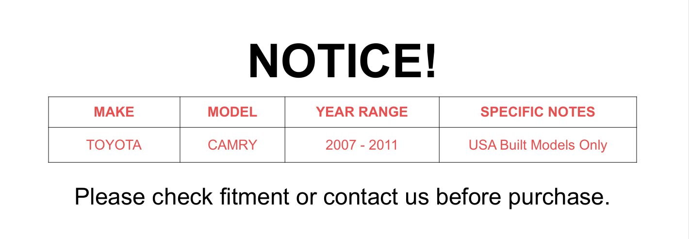 Store Categories Store Categories Hub Bearings Air Filter Suspension Parts Door handle-Interior Door handle-Exterior Window Switch Accessory Brake rotor and pads Brake Pads Brake rotor Brake Shoes ABS, Wheel Speed Sensor AC Compressor ATV Bearing Battery Charger Bolt Belt Locking Hub Car Gauge Carburetor Catalytic Converter Center Support Bearing Door Handle Cover Fuel Door Cover Oxygen Sensor Towing Strap Water Pump Wheel nut Wheel Bearings Trailer Parts Other Details 12pc Complete Front Lower Control Arm Suspension Kit Fits Driver and Passenger Sides Kit Includes: 1x Front Lower Control Arm (Driver) - K620334 1x Front Lower Control Arm (Passenger) - K620333 1x Front Lower Ball Joint (Driver) - K500044 1x Front Lower Ball Joint (Passenger) - K500043 1x Front Outer Tie Rod End Link (Driver) - ES80603 1x Front Outer Tie Rod End Link (Passenger) - ES80602 2x Front Inner Tie Rod End Link - EV800306 2x Front Stabilizer / Sway Bar End Link K750123 2x Rear Stabilizer / Sway Bar End Link - K750011 FITS: MAKE MODEL YEAR RANGE SPECIFIC DETAILS TOYOTA CAMRY 2007 - 2011 USA Built Models Only Shipping and Return Items are usually shipped out within 24 hours during the business days after payment has been received. (except Saturday and Sunday).Delivery Time is about 4-7 business days to most of regions. We are not responsible for any wrong or undeliverable addresses. Please verify and update your shipping address on eBay during checkout. • All returned products (Replacements or Refund) need to be assigned an RMA # (Return Merchandise Authorization #) prior to return. Please contact us through eBay's messaging system to obtain an RMA# for the return. Any returned product without an RMA # on package will not be accepted or processed. Warranty • All of our brand new items come with a 30-60 Days money-back guarantee. We define the item as defective only if it doesn't function as described. • It is the buyer's responsibility to understand the item description before bidding. We will replace the defective items, provided that they are in stock within the warranty period posted with the listing. We will refund the purchase price if the replacement is not available or buyer prefers a refund and send the original item back at his/her own cost. • The guarantee will be only for the cost of the item, we will not responsible for installation or other fees like labor expenses, towing expenses, additional repair expenses or other related expenses. Payment Method • PayPal Preferred, Credit or debit card through PayPal. Terms of sales Anyway, if you have any troubles,please feel free to contact us.We're willing to do anything resonable to help you out.Please do not leave any negative or neutral feedback before letting us know. thank you for your cooperate !! About us We are a leading company in the range of automotive parts, Battery products, Hub bearing, Suspension parts, Door Handle, Window Switch. We are an America company, Our Products are manufactured in TS16949 or ISO9001 certified facilities. We enjoy providing the highest quality, lowest price, best service on the market. We hope we can give you amazing shopping experience in our online store.