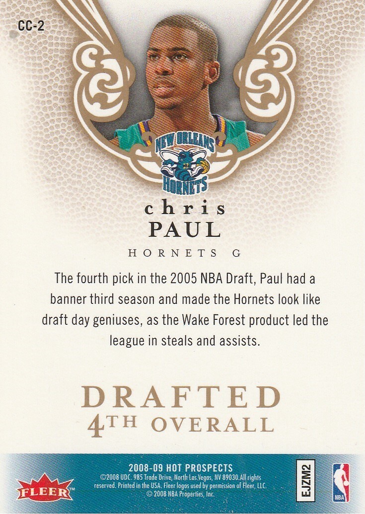 Features:Single-InsertTeam:New Orleans HornetsSet:2008-09 Hot Prospects Cream of the CropSport:BasketballType:Sports Trading CardManufacturer:FleerPlayer/Athlete:Chris PaulLeague:National Basketball Association (NBA)Card Number:CC 2Season:2008-09