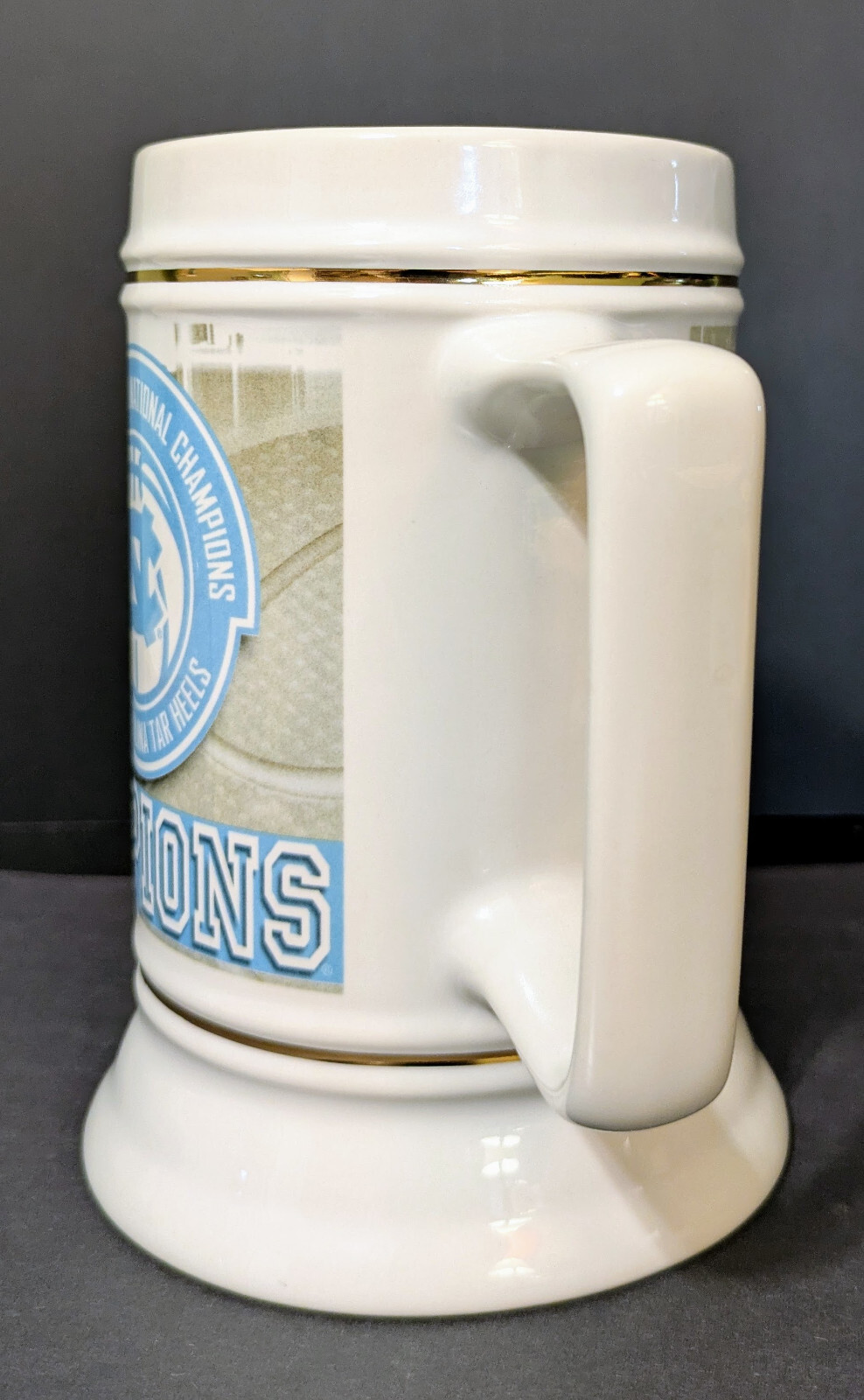 This is a 2009 North Carolina NCAA Men's College Basketball Champions Officially Licensed Stein. This commemorates the year the University of North Carolina Tar Heels Men's Basketball Team won the NCAA Men's Basketball Tournament defeating Michigan State at Ford Field in Detroit. It was UNC Coach Roy Williams second title. This Championship Stein is in EXCELLENT CONDITION! No chips, no dings, no scratches. It has been used for display only so there is a bit of scuff on the bottom of the stein. It is 6 1/4 " tall. Rim measures 3 3/4" diameter. The total width measuring from bottom to furthermost edge of handle is 6". This would make a great gift for any UNC Tar Heel fan or a great addition to a Tar Heel fan's collection. NOTE #1: I normally don't offer refunds but if this item should break during shipping I will be glad to offer one. However I do require the buyer to send me pictures of the broken item before I submit the refund. I will package this as carefully as possible. NOTE #2: Yes, I do combine shipping if you wish to buy more than one item from me! Since I use Buy It Now (payments are made immediately), please go ahead and pay for the items like normal. Then please message me on eBay afterwards that you seek to have those items combine shipped so I can be aware of it. I will do the combine shipping and typically (but not always!) a partial refund is issued if it results in shipping cost savings for the buyer. If a partial refund is owed to the buyer, I will message the buyer back with the refund amount.