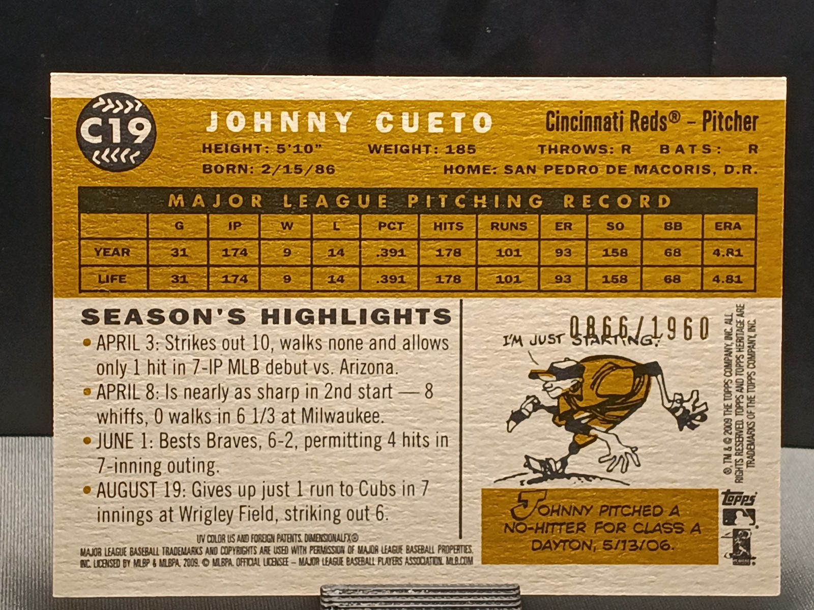 Experience the thrill of adding a piece of baseball history to your collection with the 2009 Topps Heritage Chrome /1960 #C19 Johnny Cueto card. This standout collectible features the esteemed Cincinnati Reds pitcher and is part of the highly sought-after 2009 Topps Heritage series. The card is distinguished by its chrome finish, a Parallel/Variety feature, and the fact that it's part of a limited print run of just 1960, making it a rare find for collectors. Crafted in the United States, this card captures the essence of the sport with its standard card size and quality card stock material. It is an original issue, not a reprint, and it comes in English language only. The card is not autographed, ensuring its pristine design remains the central focus. Whether you're a fan of Cueto, a Reds supporter, or a connoisseur of fine sports memorabilia, this card is an exceptional addition to any collection.