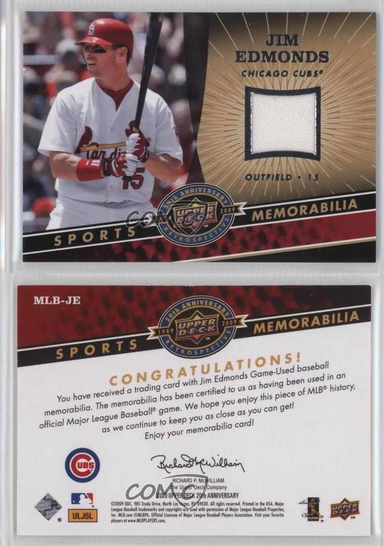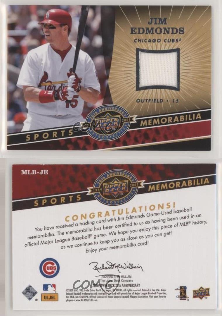 2009 Upper Deck 20th Anniversary Retrospective - Memorabilia #MLB-JE Jim Edmonds - MultiSport Card - Featuring the Chicago Cubs - Featuring Jim Edmonds Search for more: 2009 Upper Deck 20th Anniversary Retrospective Search for more: 2009 Upper Deck 20th Anniversary Retrospective - Memorabilia View all of our Listings Auctions Buy It Now About Us Located in the beautiful Pacific Northwest, COMC (Check Out My Cards) is the world's largest consignment service for trading card singles. More than 10,000 people have used our consignment service to list over 50 million trading cards. Find out how we can help you consign your items on eBay by contacting us through eBay messaging. COMC -- "The Safe & Easy Way to Buy & Sell" Representative Image - Select Specific Item above to see image of actual item Representative Image - Select Specific Item above to see image of actual item Raw Condition for Modern Cards Unless otherwise noted, raw modern cards are listed in Near Mint-Mint condition or better. A NM-MT card appears to be Mint at first glance, but upon closer inspection, may exhibit some of the following: minor print defects (e.g. roller marks, print line, dimple), minor scratches, slight edge wear, and slight corner wear. Centering is clearly visible in the images provided and does not factor into our condition assessment. Raw Condition for Vintage Cards Unless otherwise noted, raw vintage cards are listed in Excellent condition or better. An EX card may exhibit some of the following: minor rounding of corners, surface wear, print defects, light scratches, and slight edge wear/chipping. Centering is clearly visible in the images provided and does not factor into our condition assessment. Domestic Shipping Combined shipping for multiple items is available. To receive combined shipping, please ensure all desired items are in your eBay shopping cart before proceeding to checkout. eBay limits orders to 40 items per order. We automatically combine multiple orders placed on the same day. If you place multiple orders on the same day, please contact us to request a refund of applicable shipping costs. Signature confirmation may be required on invoices over $400. All cards are protected and shipped securely. International Shipping COMC offers eBay's International Shipping (EIS) for international orders under $2,500* (see country exceptions below). All duties and import fees are paid at checkout; in the rare event that there are additional import fees upon delivery, these are borne by the buyer. EIS packages route through a shipping hub in Erlanger, KY before shipping to their final destination. Please note that EIS does not allow for combined shipments. The shipping rates are determined by eBay and cannot be adjusted. *Maximum sale price exceptions: Colombia, Kuwait ($2,000); Taiwan ($1,539); Chile, Costa Rica, Guatemala, Honduras, Trinidad and Tobago ($1,000); Antigua and Barbuda, Aruba, Belize, Dominica, Grenada, Philippines, Saint Kitts and Nevis, Saint Lucia, Montserrat, Turks and Caicos Islands ($500); Dominican Republic, El Salvador ($200). Please request a shipping quote through eBay messaging for orders that exceed the maximum sale price supported by eBay's International Shipping. You will be responsible for all duties and import fees for international orders shipped outside the EIS. All cards are protected and shipped securely. Payment COMC does not accept offers on our cards through our eBay storefront. COMC utilizes eBay’s managed payments system. If you are experiencing difficulties making a payment, please contact eBay for assistance. Return Policy Returns are only accepted on the rare occasion the item is not as described. If you are making a return, please initiate the return process through eBay so a mailing label can be provided for you. Prior to listing, our expert team carefully assessed this item to represent it accurately. Please review the description and high-definition images prior to purchasing to ensure this item meets your satisfaction. We welcome you to contact us if you have further questions about this item. Trust and Integrity COMC carefully assesses each item consigned to us to prevent fraudulent items from entering the marketplace. If you believe an item offered on COMC may be fraudulent, please contact us with details so we can investigate the issue. Items we determine are outside our supported items policy may be removed. Last Modified: 6/30/2025 7:11:31 PM PDT