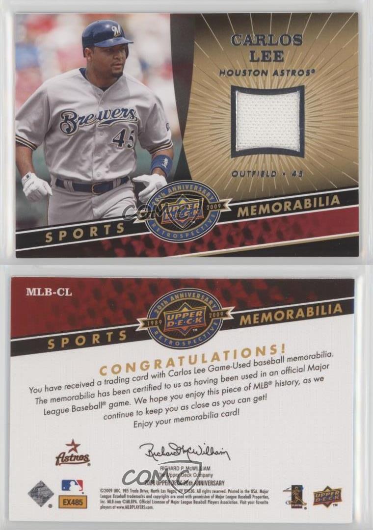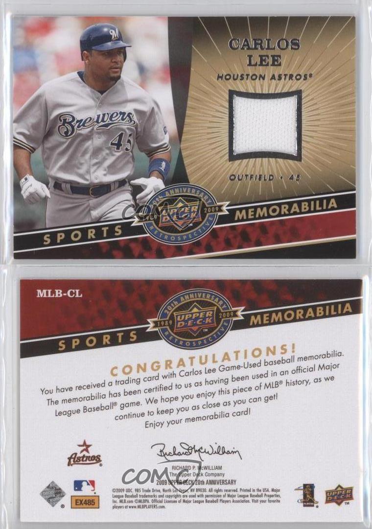 2009 Upper Deck 20th Anniversary Retrospective - Memorabilia #MLB-CL Carlos Lee - MultiSport Card - Featuring the Milwaukee Brewers and Houston Astros - Featuring Carlos Lee Search for more: 2009 Upper Deck 20th Anniversary Retrospective Search for more: 2009 Upper Deck 20th Anniversary Retrospective - Memorabilia View all of our Listings Auctions Buy It Now About Us Located in the beautiful Pacific Northwest, COMC (Check Out My Cards) is the world's largest consignment service for trading card singles. More than 10,000 people have used our consignment service to list over 50 million trading cards. Find out how we can help you consign your items on eBay by contacting us through eBay messaging. COMC -- "The Safe & Easy Way to Buy & Sell" Representative Image - Select Specific Item above to see image of actual item Representative Image - Select Specific Item above to see image of actual item Raw Condition for Modern Cards Unless otherwise noted, raw modern cards are listed in Near Mint-Mint condition or better. A NM-MT card appears to be Mint at first glance, but upon closer inspection, may exhibit some of the following: minor print defects (e.g. roller marks, print line, dimple), minor scratches, slight edge wear, and slight corner wear. Centering is clearly visible in the images provided and does not factor into our condition assessment. Raw Condition for Vintage Cards Unless otherwise noted, raw vintage cards are listed in Excellent condition or better. An EX card may exhibit some of the following: minor rounding of corners, surface wear, print defects, light scratches, and slight edge wear/chipping. Centering is clearly visible in the images provided and does not factor into our condition assessment. Domestic Shipping Combined shipping for multiple items is available. To receive combined shipping, please ensure all desired items are in your eBay shopping cart before proceeding to checkout. eBay limits orders to 40 items per order. We automatically combine multiple orders placed on the same day. If you place multiple orders on the same day, please contact us to request a refund of applicable shipping costs. Signature confirmation may be required on invoices over $400. All cards are protected and shipped securely. International Shipping COMC offers eBay's International Shipping (EIS) for international orders under $2,500* (see country exceptions below). All duties and import fees are paid at checkout; in the rare event that there are additional import fees upon delivery, these are borne by the buyer. EIS packages route through a shipping hub in Erlanger, KY before shipping to their final destination. Please note that EIS does not allow for combined shipments. The shipping rates are determined by eBay and cannot be adjusted. *Maximum sale price exceptions: Colombia, Kuwait ($2,000); Taiwan ($1,539); Chile, Costa Rica, Guatemala, Honduras, Trinidad and Tobago ($1,000); Antigua and Barbuda, Aruba, Belize, Dominica, Grenada, Philippines, Saint Kitts and Nevis, Saint Lucia, Montserrat, Turks and Caicos Islands ($500); Dominican Republic, El Salvador ($200). Please request a shipping quote through eBay messaging for orders that exceed the maximum sale price supported by eBay's International Shipping. You will be responsible for all duties and import fees for international orders shipped outside the EIS. All cards are protected and shipped securely. Payment COMC does not accept offers on our cards through our eBay storefront. COMC utilizes eBay’s managed payments system. If you are experiencing difficulties making a payment, please contact eBay for assistance. Return Policy Returns are only accepted on the rare occasion the item is not as described. If you are making a return, please initiate the return process through eBay so a mailing label can be provided for you. Prior to listing, our expert team carefully assessed this item to represent it accurately. Please review the description and high-definition images prior to purchasing to ensure this item meets your satisfaction. We welcome you to contact us if you have further questions about this item. Trust and Integrity COMC carefully assesses each item consigned to us to prevent fraudulent items from entering the marketplace. If you believe an item offered on COMC may be fraudulent, please contact us with details so we can investigate the issue. Items we determine are outside our supported items policy may be removed. Last Modified: 6/30/2025 6:53:13 PM PDT