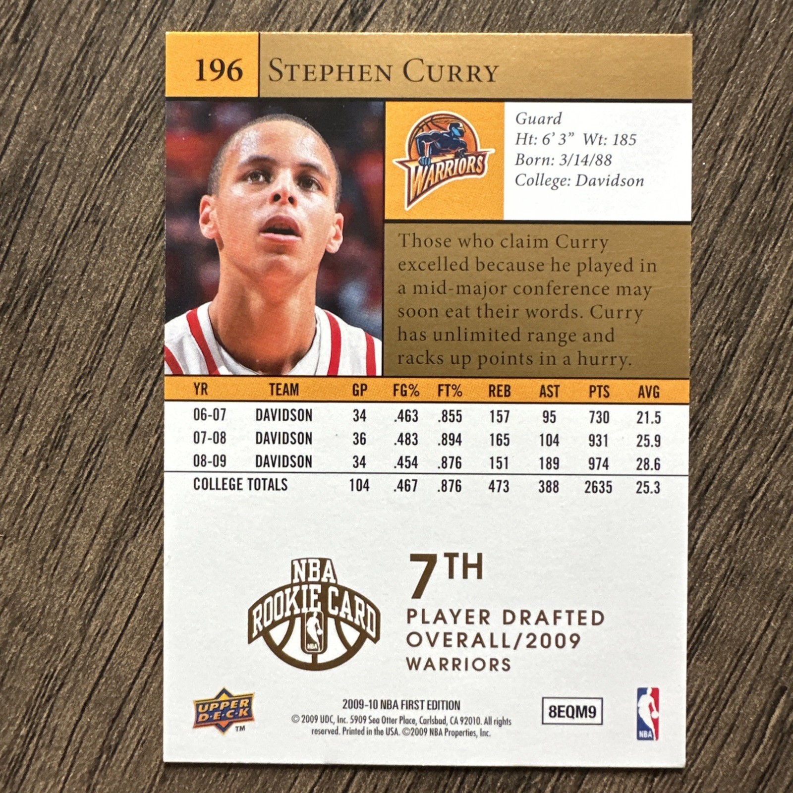 Set:2009-10 Upper Deck First EditionFeatures:Rookie, Base Set, Parallel/VarietySeason:2009-10League:National Basketball Association (NBA), National Collegiate Athletic Association (NCAA)Team:Davidson Wildcats, Golden State WarriorsPlayer/Athlete:Stephen CurryManufacturer:Upper DeckType:Sports Trading CardCard Number:196Parallel/Variety:GoldSport:Basketball