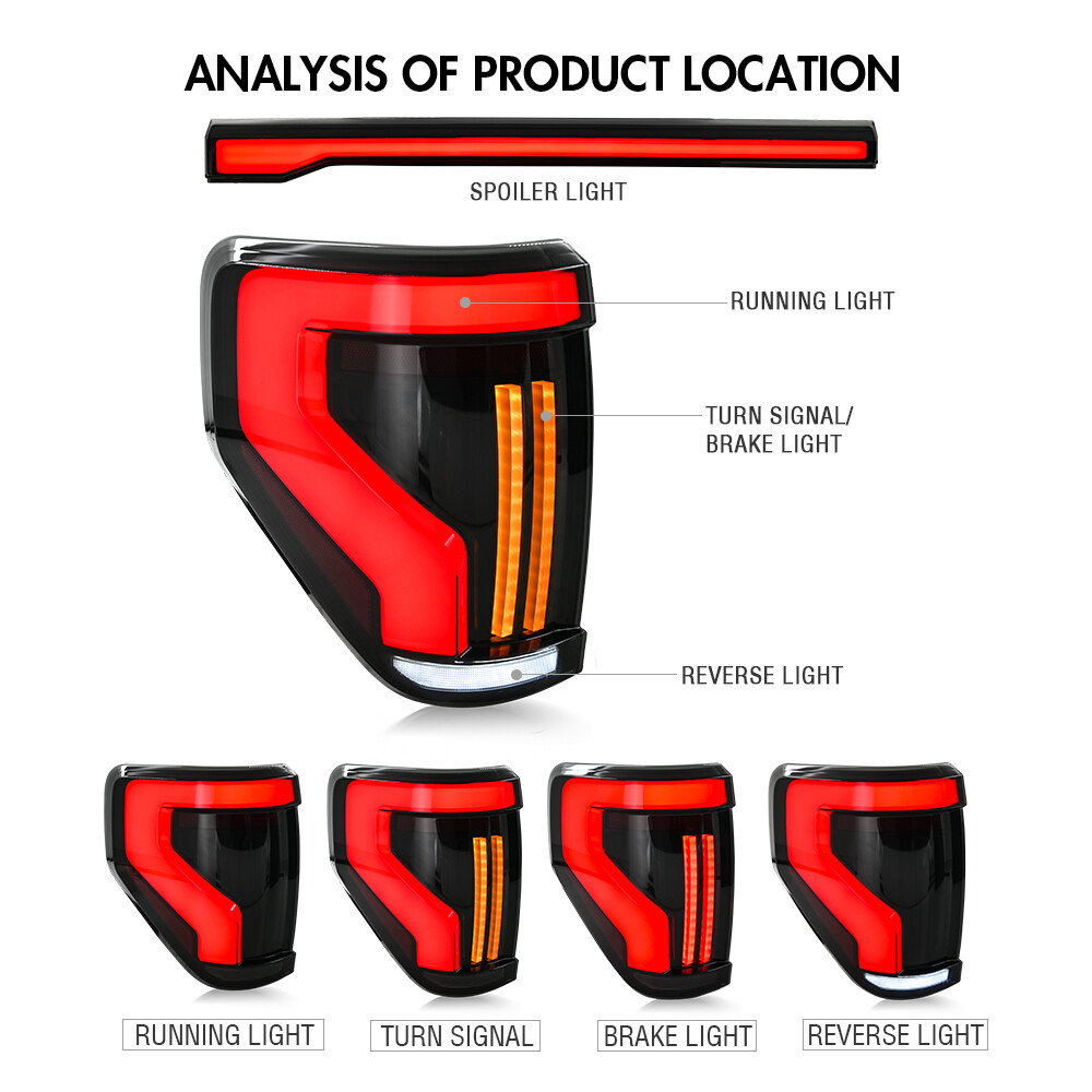 LED Tail Lights Center Trunk Light For 2009-2014 Ford F150 Rear Lamps Assembly Features: 1. One pair: Left + Right + Center Trunk tail lights 2. Tail Light Lens: Smoked Lens, Chrome Housing 3. Bulbs: All bulbs are built-in LED, no extra bulbs needed 4. Function: Rear Running Light (Red)+Turn Signal(Amber )+Reverse(White)+Brake (Red) lights 5. Easy installation: plug and play,same as original one to install 6.Assembly: all parts are included in the package,no need to buy extra bulbs or harness Fitment Fits For 2009-2014 Ford F150 ( Professional Installation is Highly Recommended ) Package include 1 Pair of Taillights (driver's side + passenger's side) Note 1. Please confirm whether this car-lamps can fit your car before buying, if you are not sure, please contact us and send us pictures of your original car light or plug. 2. Using your factory supplied connector/harness will avoid cutting or modifying any wires. Specification ·100% Brand New ·Professional Installation is Highly Recommended ·Welcome to send us message for more information Warranty: One-Year warranty after receiving After Sales Service Please contact us before returning the products, we will do our best to help you solve all the problem well with good service!!! Questions Any question will be replied within 24 hours except the weekend and holiday. We will serve for you all sincerity!