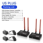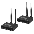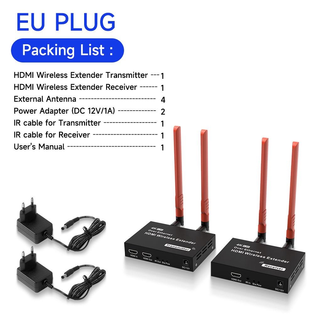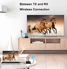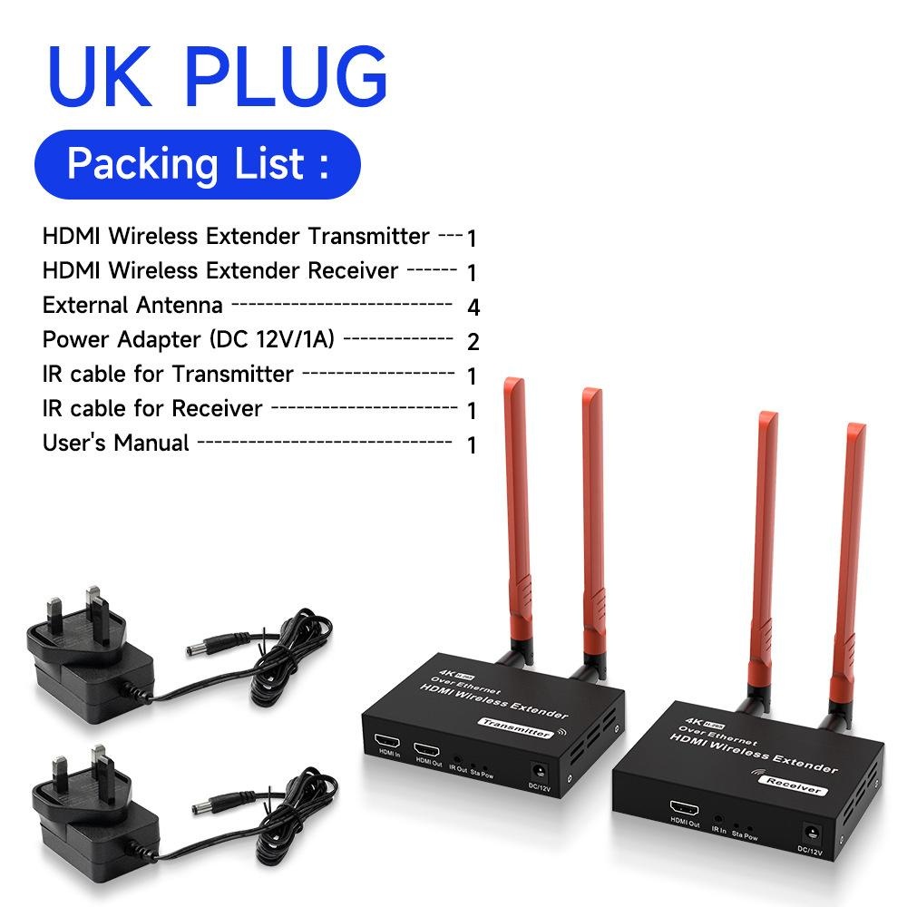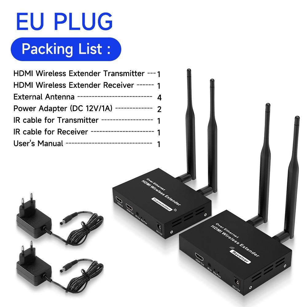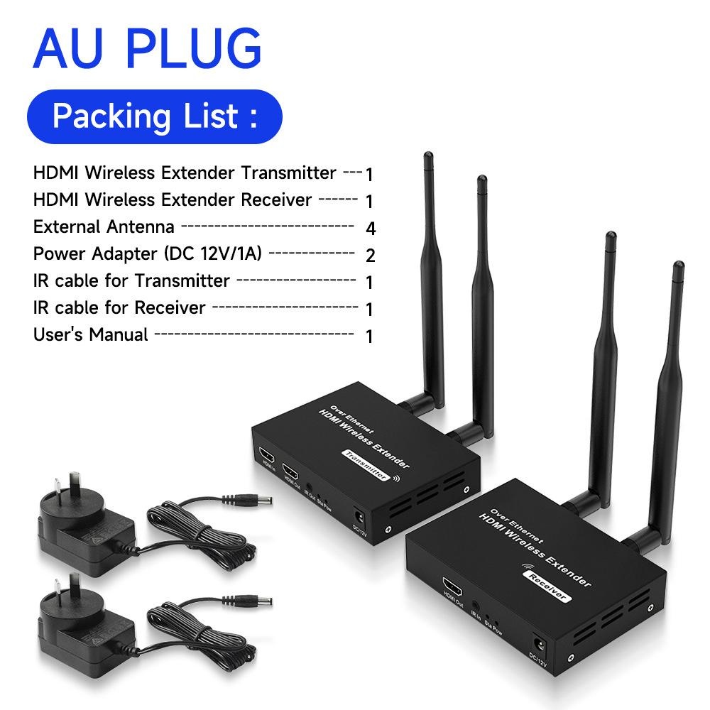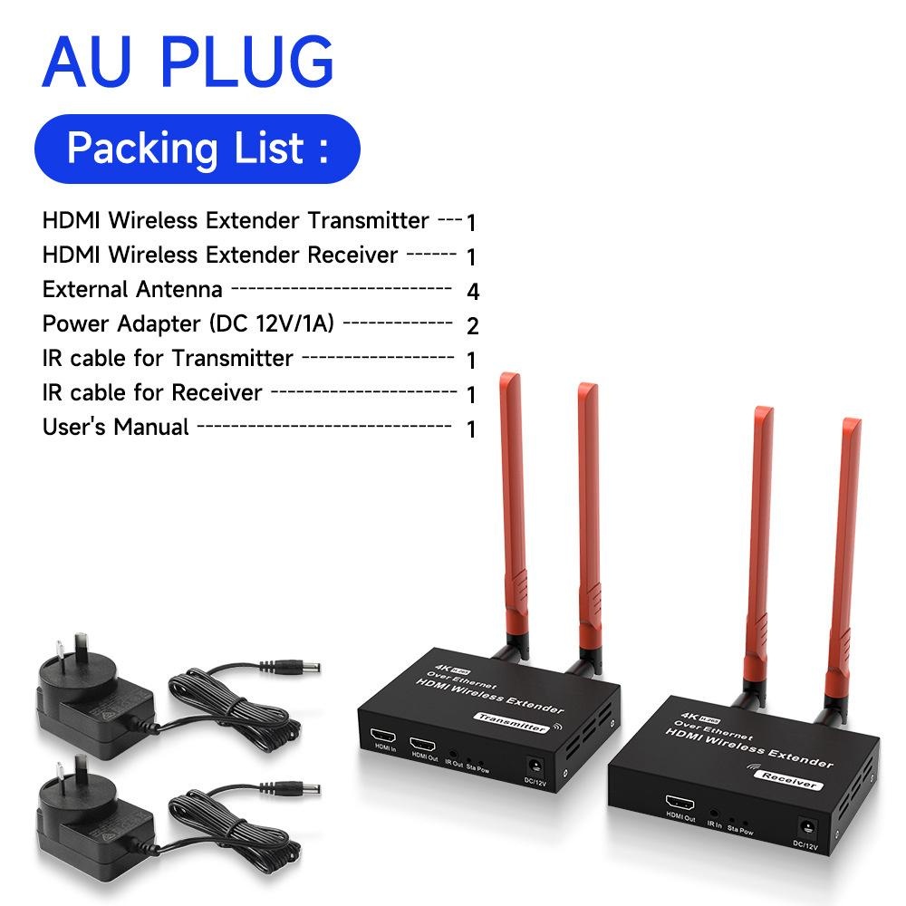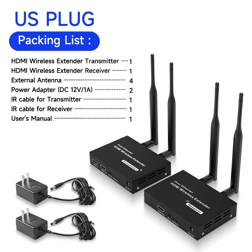 Production Introduction 1.Introduction: The HDMI Wireless Extender provides an easy way to extend HDMI signals wirelessly up to 200/300 meters. It extends HDMI A/V content from computers using HDMI, set-top boxes, Blu-ray players, and other A/V sources to remote HDM-compliant display(s). 2.Features: 1. This wireless HDMI extender is comprised of a Transmitter unit and a Receiver unit 2. Support loop-out at transmitter end for an easy monitor 3. Support wide range of resolutions including 480i/576i ~ 1080p@50/ 60Hz,4K 30HZ SVGA 4. Support 2. 4G/5G dual frequency , fast transmit and strong anti-disturbance 5. External antenna support long range of transmission up to 200/300 meters. 6. Support IR extension for source device control at the display end . 7. Plug and play, no need drivers for PC installation. Package List: HDMI Transmitter 1 PCS HDMI Receiver 1 PCS External Antenna 4 PCS Power Adapter 2 PCS IR Cable for Transmitter 1 PCS IR Cable for Receiver 1 PCS User Manual 1 PCS