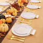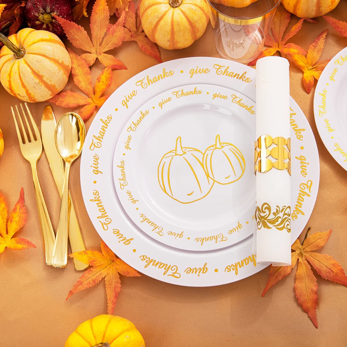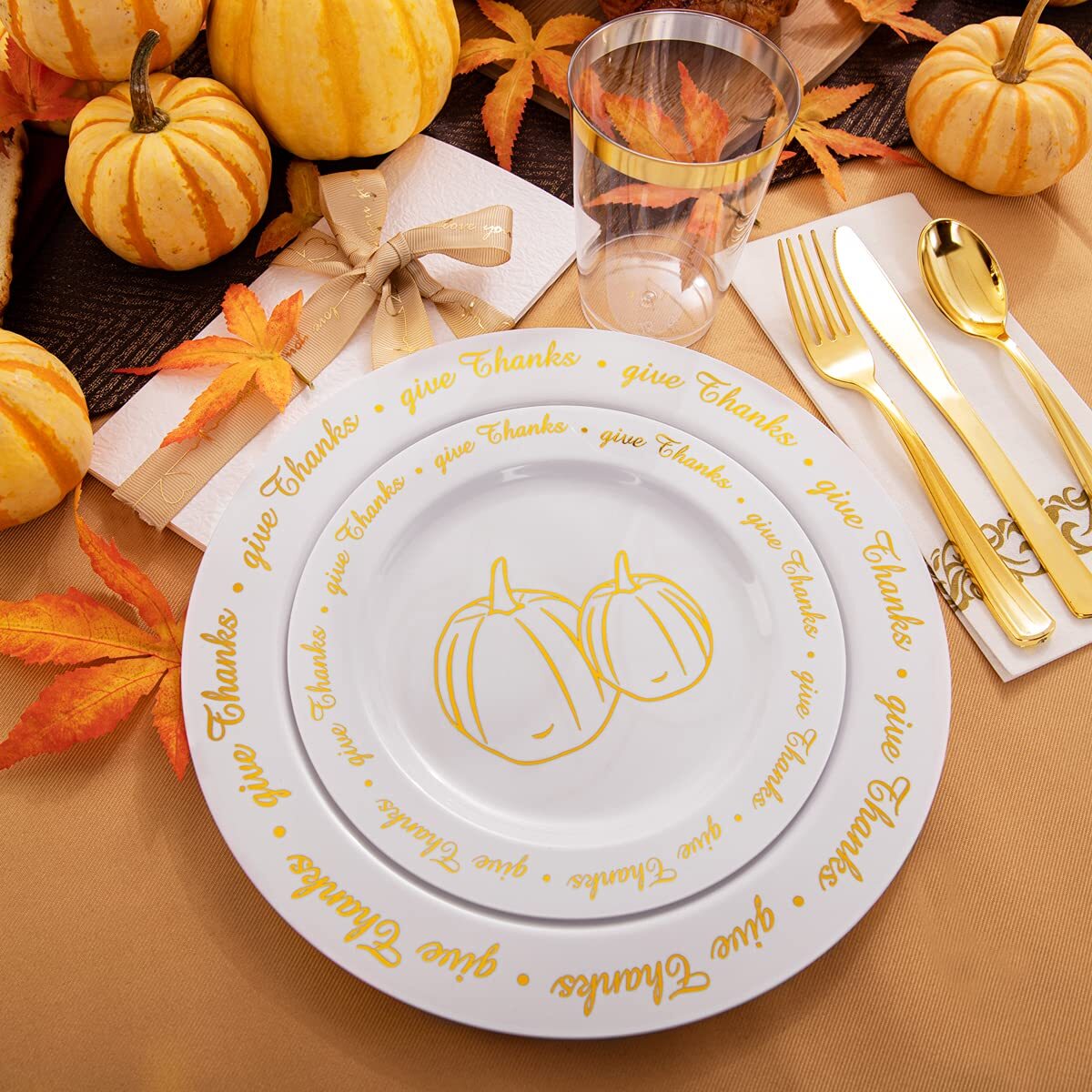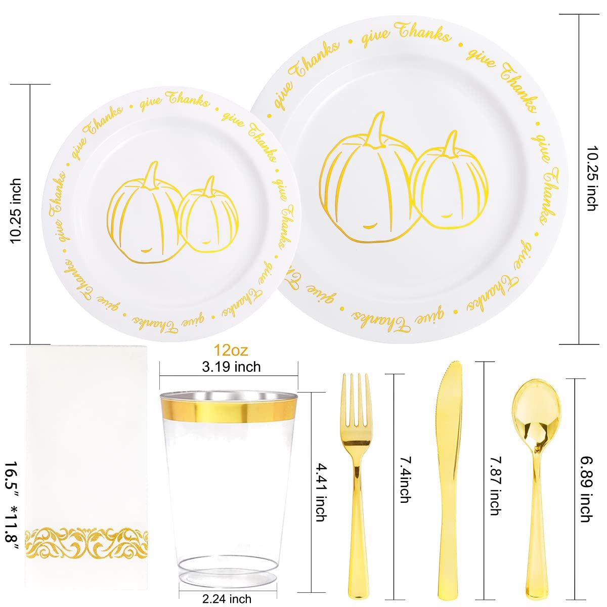 " Specification: Color: plate-white with gold design; cutlery- gold color Material: PS Product Description: Enjoylife's target: our goods can enlightening your life and make your life more brighter.Gold cutlery set specially designed for Thanksgiving. Recyclable and BPA Free: The gold party plates are healthy and safety to any kind of food. Best Quality:We always try to offer the best quality products to you. The disposable gold plates and gold cutlery used heavyweight plastic for long-lasting strength. They are resistant to breaking, bending and snapping. The gold plates have a beauty design and feature a beautiful and elegantly designed gold rim. It can use to any kind occassion such as wedding, birthday and on on. Unique Feeling:This gold plastic dinnerware set is simply dazzling with a universal appeal that will complement your any party theme.These heavyweight plastic gold plates are designed to withstand even the most temperature intensive foods while maintaining their form and shape. They will last through the entire meal till they are thrown out, or washed and reused for the next meal. Save clean-up time by throwing them out after use, while still enjoying the decorative and elegant accent they add to your event. NOTE & TIPS: After party you can dispose these disposable plates and cutlery. No dishwasher and microwave. If you try to keep them and reuse them, please hand wash and dry them after using , Stored in dry place for its durability. BEST CUSTOMER SERVICE TEAM Contact us if you are not satisfied with the gold disposable plates and cutlery, we’ll process full refund or send you a replacement without returning or any additional conditions." Happy Thanksgiving:A gold pattern plate specially designed for Thanksgiving! Create a strong Thanksgiving atmosphere, the white and gold match is beautiful and elegant, which will surprise you and your family! Value Pack: Thanksgiving plastic plates set include 25 gold dinner plates, 25 gold salad plates, 25 gold knives, 50 gold forks, 25 gold spoons,25 gold cups,25 gold napkins.Put in a sturdy box which can be gift too. Popular Design: Gold thanksgiving plastic plates with the elegant design which is the most popular one in the market. looks like real China match to the gold cutlery which can make left great expression to your customer. HEALTHY: Gold thanksgiving plastic plates made of 100% food grade plastic, BPA free and no toxic . The high-quality gold dinner plates with thanksgiving design offers reliable strength and durability, sturdy and healthy. SAVE TIME: The gold plastic plates are disposable plates. After the meal, you can throw away and enjoy more time with your family and friend. So convenient and release your hands.100% food grade, BPA-free plastic,Not dishwasher and microwave.