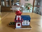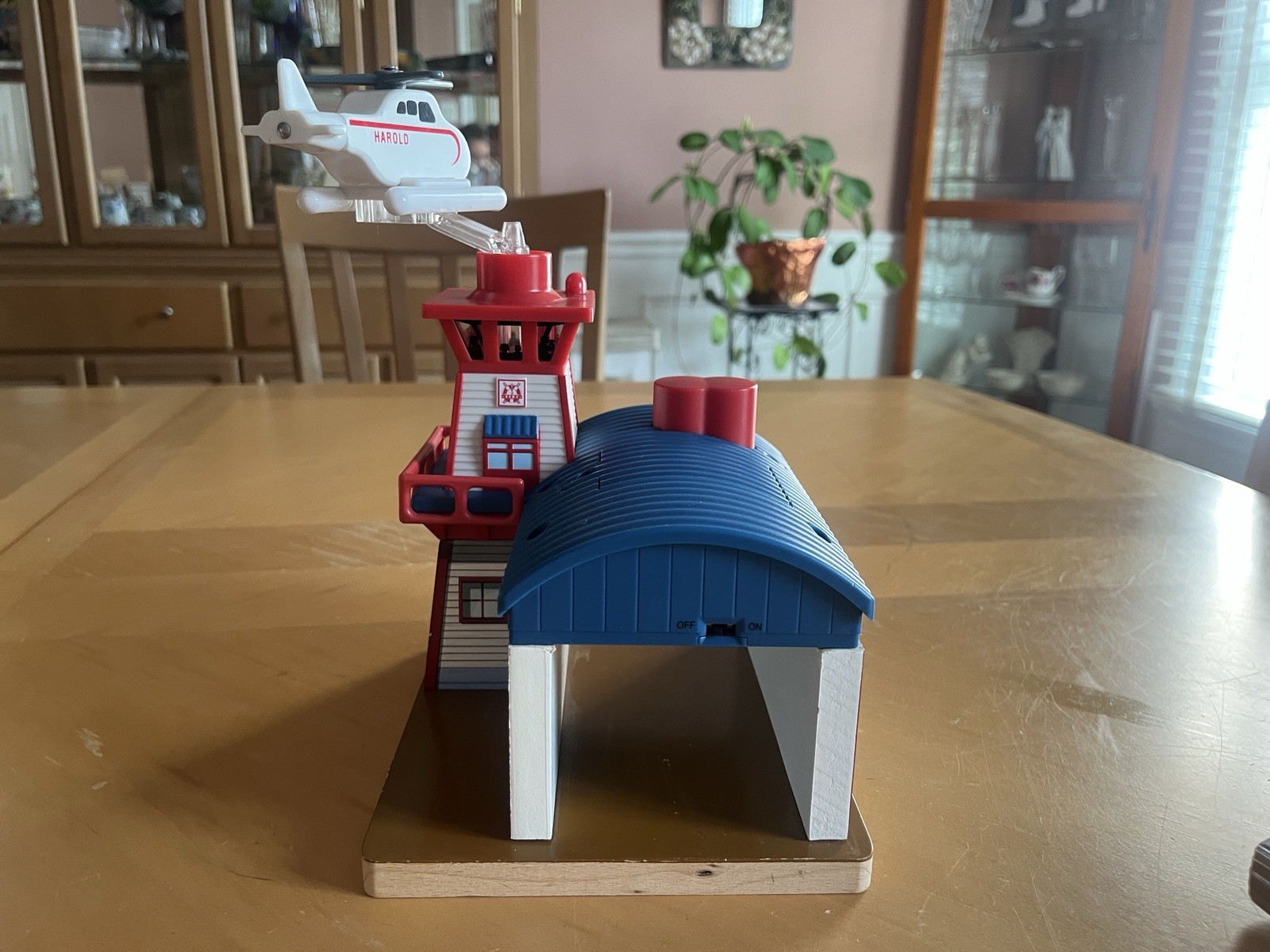 This is the Thomas Wooden Railway Harold’s Helipad from 2010, complete with all parts including the exclusive Harold the Helicopter. Features include lights, sounds, and a spinning Harold the Helicopter. This item includes the main wooden shed, transparent holding arm, Harold, and the magnetic helipad. All are in very good condition with only minor paint scratches. I am unsure of whether or not the electronics features still work, but I assume they do.