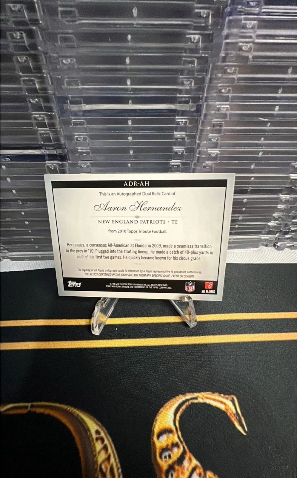 The 2010 Topps Tribute Autographed Dual Relics card featuring Aaron Hernandez from the New England Patriots is a limited edition collectible with a print run of only 99. This card, numbered #ADR-AH, includes memorabilia and is considered a rookie card, making it highly sought after by NFL fans and collectors. Created by Topps, this dual relic card showcases Hernandez's autograph and is a valuable addition to any football card collection.