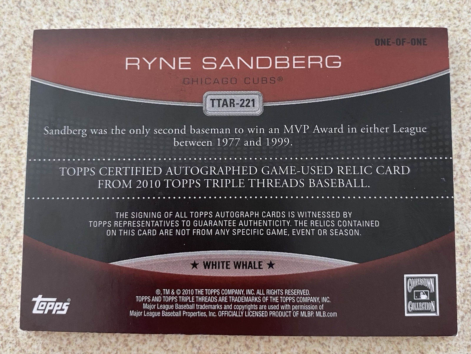 Up for sale is a 2010 Topps Triple Threads Ryne Sandberg 1/1 White Whale multi color patch relic auto. This card has never been graded and is in good condition.