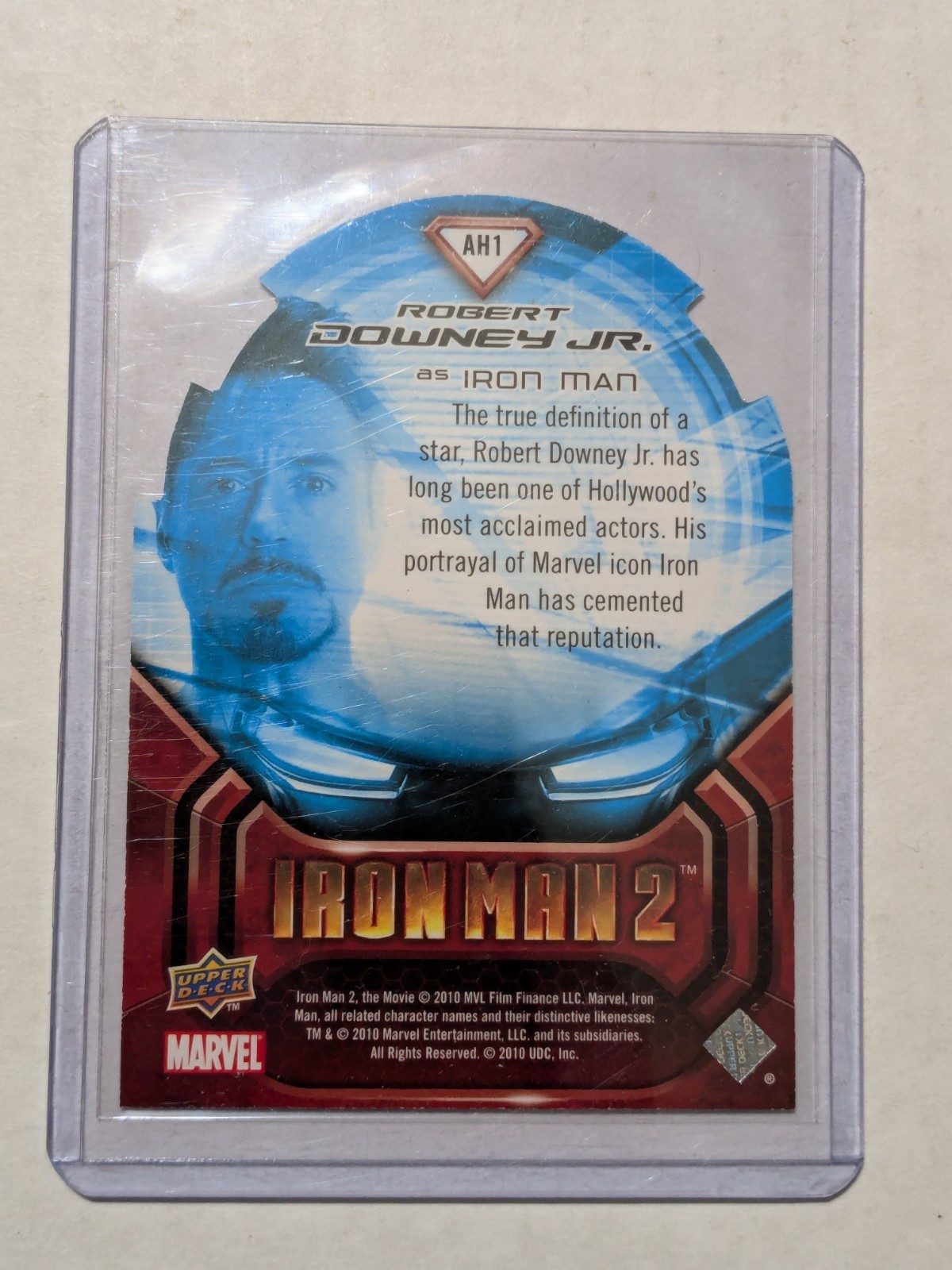 Please read the ENTIRE description before purchasing anything. Thank you. Greetings. You are buying the following: 2010 Upper Deck / Marvel - Iron Man 2 - Robert Downey Jr Tony Stark #AH1 Die-Cut If graded would be at least an 8 or better (IMO). See pics for cards and conditions VG/EX/NM/Mint condition is based on my non-professional opinion. The item is considered used as it is no longer in the packs. Shipping for this item is FREE. Cards are shipped using either an eBay like envelope or a small box (depending on card costs and # of cards purchased) and in a penny sleeve or a top loader depending on value of the card. If you have any questions, please ask them before buying the card/s. Shipping is Free.