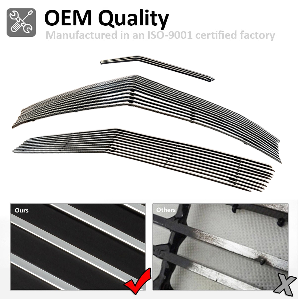 This billet grill combo instantly upgrades the front end of my 2012 Camaro SS—the polished silver finish looks aggressive and premium. Installation was tool-free in under 30 minutes; no drilling needed! The aluminum feels sturdy, and the precise fit gives a factory-quality look. Zero complaints after months of driving—still shines like new. Perfect mod for Camaro owners wanting bold style without permanent changes.