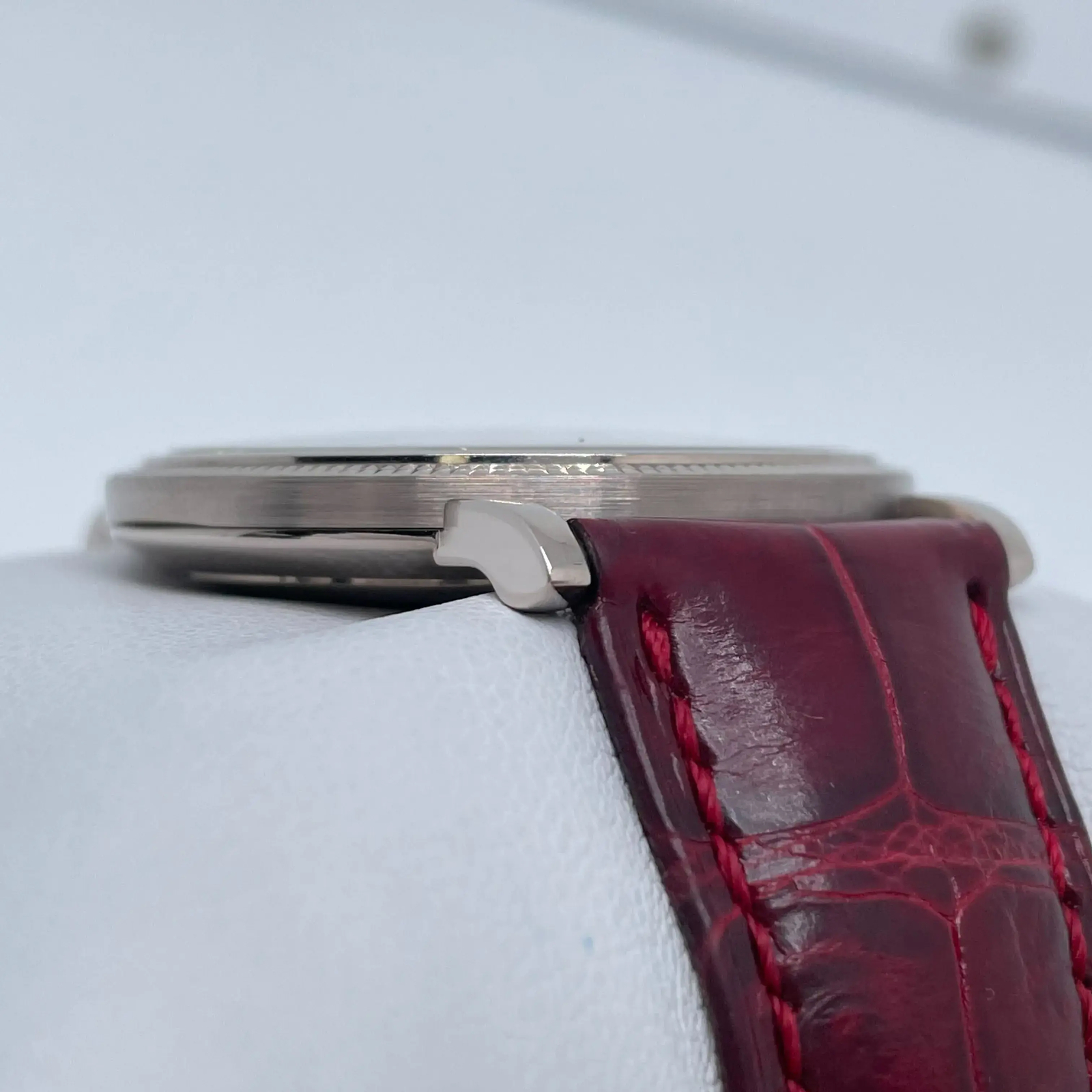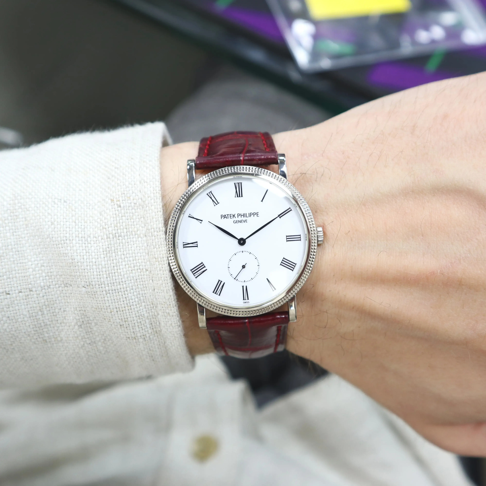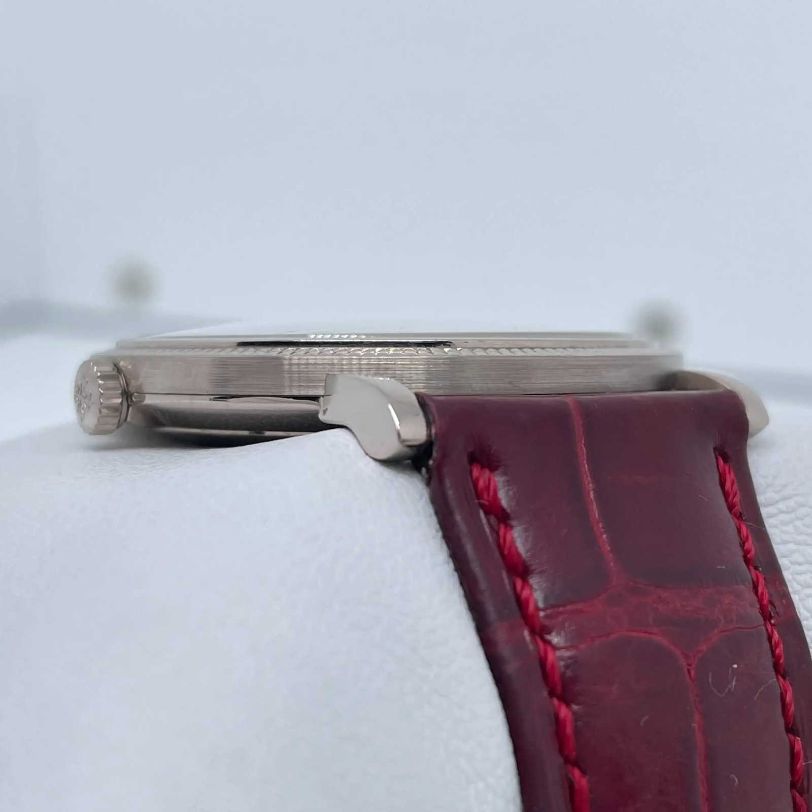 Mint preowned condition. Clean dial and hands, the watch has been tested and calibrated and keeps time well. Original box and papers are not included. Backed by a 1-year warranty and a 30-day return window. 2010's Mint Patek Philippe 5119G-001 Calatrava 36mm 18k White Gold Manual Watch Description Mint preowned condition. Clean dial and hands, the watch has been tested and calibrated and keeps time well. Original box and papers are not included. Backed by a 1-year warranty and a 30-day return window. Ships from Address 608 5th Ave, STE 408 - New York New York, 10020 Phone 16465368182 Condition Excellent Good Fair Poor The movement is calibrated and keeps time well. The watch shows light signs of wear or scratches. Highlights Weight 52g Case Size 36 mm Wrist Fit 7.75 Inches Box No Papers No SKU 037345 General Info MSRP 21500 Brand Patek Philippe Type Wristwatch Department Men Model Number 5119G-001 Country/Region of Manufacture Switzerland Style Luxury Model Calatrava Vintage No Features/Other Details Year Manufactured 2010-2019 Customized No Handedness Right With Original Packaging No With Service Records No With Booklet No With Papers No SKU 037345 Features 12 Hour Dial, PushPull Crown, Small Seconds Subdial, Swiss Made, Swiss Movement, Water-Resistant, Fixed Bezel, Sapphire Crystal Band/Bracelet Details Band Color Red Band Material Leather Max Wrist Size 7.75 Inches Closure Buckle Band Type Two-Piece Strap Band Width 16 mm Lug Width 20 mm Wrist Fit 7.75 Inches Case Details Case Material White Gold Case Color White Water Resistance 30 m (3 ATM) Watch Shape Round Caseback Exhibition Case Finish Polished Case Size 36 mm Case Thickness 8 mm Bezel Details Bezel Type 12-Hour, Fixed Bezel Color White Display Dial Color White Display Analog Indices Roman Numerals Movement Movement Manual Number of Jewels 18 Jewels Movement Caliber 215 PS Shipping Warranty Return Policy FAQ All in stock items are shipped within one business day. Same day shipping is available upon request. Due to insurance purposes, all packages are shipped with a tracking number and signature is required. We do not ship to PO Boxes. Import duties, taxes, and charges are not included in the item price or shipping cost. These charges are the buyer's responsibility. Please check with your country's customs office to determine what these additional costs will be, prior to bidding or buying. All watches sold by Luxxwatches are covered with in-house warranty for a period of Watches that lose time, gain time, do not change day or date, or have any other signs of not working properly will be serviced under our warranty program.The Luxxwatches warranty does not cover any damage resulting from water damage or physical harm. Additionally, the warranty does not cover polish for the watch case, any damage to crystal, band, bezel, straps, screws, crown/stem, finishes, clasps/buckles which are a result of normal wear and tear. Any lost parts of the watch, including stones, is not covered with the warranty. Any damage incurred as a result of exceeding the limitations of the watch manufacturer’s water resistance guidelines will not be covered with the warranty. Any third-party repairs, outside modifications or customizations will void the warranty. All the items purchased from Luxxwatches are covered with a 30-day money back guarantee. If you are not fully satisfied with your purchase, you may exchange or return your item for a refund within 30 days of first receiving your item. Item must be in the same condition as it was received, and include all original booklets, box & packaging. Any signs of wear, water damage, or altering will result in refusal of your return.Special order items, such as items we do not have in our warehouse and are specially ordered from our distributor or items that have been customized, are non-returnable.We offer free returns on eligible items, please contact us for the return shipping label. How to start an automatic watch? It’s very important to wind an automatic watch properly, prior to its use. The initial wind provided may only last a short while, making the watch appear defective once it stops ticking. To ensure your watch functions to the fullest of its capabilities, wait for it to stop and then wind the watch counter-clockwise 15-20 times. Next, push the crown back, screwing it down to preserve the water-resistance. *Be mindful that excessively winding the watch may cause damages to the movement, so don’t overdo it. Unlike self-winding watches, the crown doesn't need to be wound on quartz models. If it still isn’t ticking, simply bring it by for a battery replacement. Why the watch is running slow? A watch can lose time for various reasons including, but not limited to a dying battery, which will cause the second-hand to begin jumping across several seconds at once instead of passing each individually, magnetization, causing tension between small parts within the movement and natural friction from the watch being worn. If the watch is a mechanical model (Automatic or Manual-wind) this can also be a sign that the watch needs to be overhauled. How to use a chronograph? Operating a Chronograph requires using the pushers on the side of the case. The top pusher is used to start and stop the chronograph hand while the one at the bottom is used to reset it. Once the top pusher is pressed, the hand will run continuously, which you can track using the accompanying sub-dial. In order to reset the chronograph, it has to be stopped first. Otherwise the button will do nothing when pressed. How to set the date & time? Whether you have a screw or push-down crown, setting the date and time is simple. If its a screw-down, unscrew it by turning it downward, counterclockwise prior to following these steps. Pull out the crown to the first integer to operate the date alone, allowing the time to continue ticking. Pulling the crown out farther, you’re then allowed to adjust the time, which also shifts the date after each 