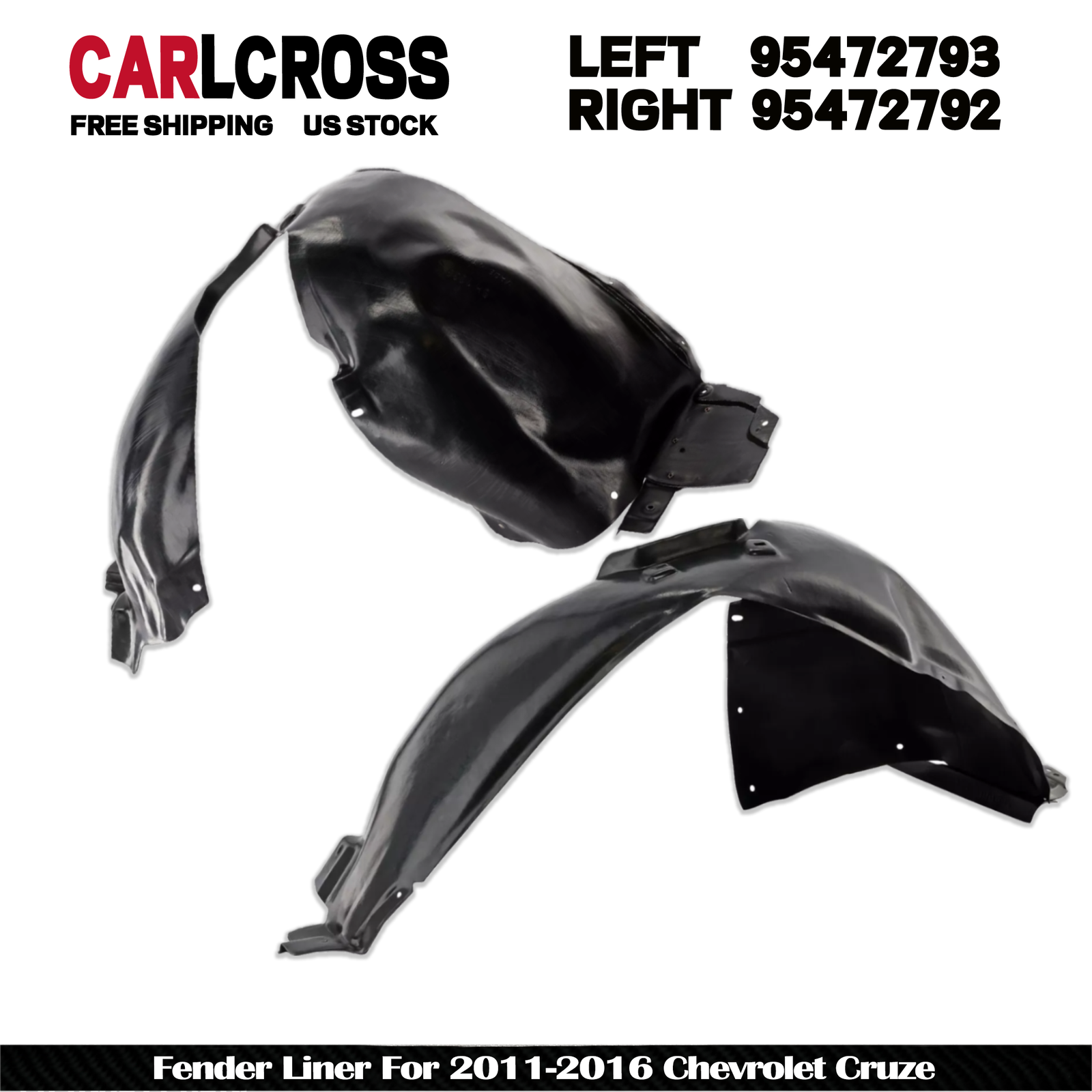 Fender Liner For 2011-2015 Chevrolet Cruze Front Driver and Passenger Side Description Replacement Fender Liner REPLACEMENT FENDER LINER Replacement fender liners perform just like the original to protect your engine compartment from dirt, mud, water, and other contaminants. Each Replacement fender liner is made to factory specifications, allowing you to easily restore your vehicle to its original condition. Features & Benefits: Easy to Install Designed as a direct replacement for your original fender liner. Keeps factory ducting for brakes or fluid coolers. Made to factory specifications for a hassle-free installation, guaranteed. Premium Protection Durable, high-quality construction defends against dirt, mud, water, and other contaminants. Ready to restore your vehicle to like-new condition. Benchmark Design and Manufacturing Processes Replacement brand fender liners are the result of extensive research and development, ensuring a state-of-the-art design and flawless performance. Lean manufacturing process keeps costs down and quality high. One-Year Unlimited Mileage Warranty Every Replacement fender liner comes with a one-year unlimited mileage warranty for peace of mind. Notes Location : Front, Left and Right Side Brand New in the Box - Fit and Quality Guaranteed! Anticipated Ship Out Time Same day - 1 business day Quantity Sold Set of 2 Replaces OE Number 95472792, 95472793 Replaces Partslink Number GM1249226, GM1248226 Notes Without Insulation Foam Interchange Part Number 95472792, GM1249226, 95472793, GM1248226 Prop 65 Warning WARNING: This product can expose you to chemicals including Chromium, Lead and lead compounds, which is known to the State of California to cause cancer and birth defects or other reproductive harm. For more information go to www.P65Warnings.ca.gov. For Online Marketplace For Online Marketplace Returns Policy 30-Day Return Policy Components (2) Fender Liner Insulation Foam Without Insulation Foam Location Left and Right, Front Compatible with the following vehicles: Chevrolet 2014-2015 Cruze Diesel 2015-2016 Cruze L 2016 Cruze Premier 2011-2015 Cruze (submodel: Eco, LTZ) 2011-2016 Cruze (submodel: LS, LT) 2016 Cruze Limited (submodel: Eco, L, LS, LT, LTZ) On Jan 24, 2025 at 07:47:39 PST, seller added the following information:
