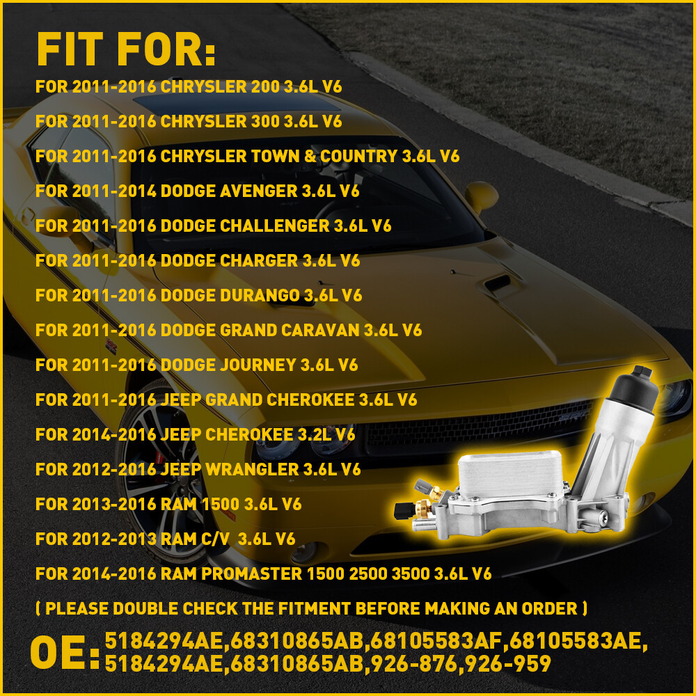 Aluminum Oil Cooler & Oil Filter Housing Adapter for Chrysler Dodge Jeep Fits for: For 2011-2016 Chrysler 200 3.6L V6 For 2011-2016 Chrysler 300 3.6L V6 For 2011-2016 Chrysler Town & Country 3.6L V6 For 2011-2014 Dodge Avenger 3.6L V6 For 2011-2016 Dodge Challenger 3.6L V6 For 2011-2016 Dodge Charger 3.6L V6 For 2011-2016 Dodge Durango 3.6L V6 For 2011-2016 Dodge Grand Caravan 3.6L V6 For 2011-2016 Dodge Journey 3.6L V6 For 2011-2016 Jeep Grand Cherokee 3.6L V6 For 2014-2016 Jeep Cherokee 3.2L V6 For 2012-2016 Jeep Wrangler 3.6L V6 For 2013-2016 Ram 1500 3.6L V6 For 2012-2013 Ram C/V 3.6L V6 Oil Cooler&Oil Filter Housing Adapter For 2011-2016 Dodge Charger3.6L Journey V6 Aluminum Oil Cooler & Oil Filter Housing Adapter for Chrysler Dodge Jeep Fits for: For 2011-2016 Chrysler 200 3.6L V6 For 2011-2016 Chrysler 300 3.6L V6 For 2011-2016 Chrysler Town & Country 3.6L V6 For 2011-2014 Dodge Avenger 3.6L V6 For 2011-2016 Dodge Challenger 3.6L V6 For 2011-2016 Dodge Charger 3.6L V6 For 2011-2016 Dodge Durango 3.6L V6 For 2011-2016 Dodge Grand Caravan 3.6L V6 For 2011-2016 Dodge Journey 3.6L V6 For 2011-2016 Jeep Grand Cherokee 3.6L V6 For 2014-2016 Jeep Cherokee 3.2L V6 For 2012-2016 Jeep Wrangler 3.6L V6 For 2013-2016 Ram 1500 3.6L V6 For 2012-2013 Ram C/V 3.6L V6 For 2014-2016 Ram ProMaster 1500 2500 3500 3.6L V6 ( Please double check the fitment before making an order. ) Specifications: OE: 5184294AE, 68310865AB, 68105583AF, 68105583AE, 5184294AE, 68310865AB, 926-876, 926-959 Features: *Superior material Made of upgraded aluminum material to replace the original fragile oil filter and provide a better performance. *High temperature resistance The product with high temperature resistance and leakproof functions ensures its long service life and durability. *Complete accessories Equipped with all components required for installation,including oil temperature sensor,oil pressure sensor,oil cooler,O-ring,intake manifold etc. *Simple installation Simple installation with direct replacement,other modifications are not required. Packaging include: 1 x Engine Oil Cooler Filter Adapter Housing [with Oil Pressure & Temperature Sensor, O-Rings (Installed), Oil Filter (new pre-installed) & Oil Filter Cap] 6 x Gaskets (for Upper intake manifold) 6 x Gaskets (for Lower intake manifold) Item Specifics Brand AUXITO Placement on Vehicle Front Manufacturer Part Number JYLQQZC-Ram-13-16-L Interchange Part Number 5184294AE, 68310865AB, 68105583AF, 68105583AE Type Engine Oil Filter Housing Manufacturer Warranty 5 Years Features Easy Installation OE/OEM Part Number1 5184294AE, 68310865AB, 68105583AF, 68105583AE Gasket Material Rubber Material Aluminum Universal Fitment Yes Items Included Cover, Gasket, O-Ring, Screws, Seal, Oil Filter, Oil Cooler Engine 3.6L V6 OE/OEM Part Number2 5184294AE, 68310865AB, 926-876, 926-959 FAQ ♥ If you have a decoding problem or any other problems, please contact us first, we will help you with it. We will reply you within 24 hours in working days. I'm a new seller, thanks a lot for your trust and convince! I will serve you with all my heart. ♥ Q1: Will this bulb fit my vehicle? A: We can match almost any vehicle to one of our bulb sizes. eBay only lets us include some vehicle fitments per listing, but if your vehicle does not show up on the compatibility table at the top of our listings, welcome you to contact us for free consulation before purchasing a product. Q2: My item has not arrived, what's taking so long? A: Sometimes items take longer than expected, especially if it’s going far or to rural area. Check with your post office to see if your item has been held up. Sometimes Royal Mail will not update a tracking number until it has arrived at its destination. If your item still don't arrive after a few days, let us know so we can double check for you and help solve it asap. Q3: My bulbs won't fit, help! A: Special bulb holder may be required. See if you can take the holder from the stock bulb. If not, let us know. The bulb size may be wrong, double check the item you received with the item you ordered. Do you have an aftermarket lighting housing? These may not be perfectly fitted for aftermarket bulbs and will require some manual modifications. Q4: Neither side lighting up? Both sides flicker, hyper flash, or work inconsistantly. A:Check the light fuses, and then check the ballast plugs to insure correct installation. If this doesn't work, there may be a voltage problem with the vehicle. You probably just need a relay or capacitor. Even though some bulbs are builtin resistors, they may still need a decoder. Pay & Ship (1). We gladly accepts payment via PayPal, We will ship your item(s) within 24 hours. (2). Before payment, please keep the consistency of Paypal address and ebay address. (3). Quantity orders are welcome! Returns (1). We offer 60 days free return policy. Please contact us within 60 days from the date you receive your order if you have any issues with the product or want return. Refund will be send after we got your resend package. (2). All returned items should be in the original packaging , return tracking information should be provided . Contact Us (1).Negative feedback will not help resolve any problems you have, please contact us via eBay messages before leaving negative feedback , our customer service will make best effort to help you with the issues. (2).We maintain high standards of excellenceand strive for 100% customer satisfaction! Feedback is very important to us. We request that you contact us immediately before you give us neutral or negative feedback, so that we can satisfactorily address your concerns. About us We're professional in car and motorcycle accessories, especially in LED bulbs. We have our own factory and R&D team. Our belief is to sell top quality items that fit your car and serve you with our heart. Anything please feel free to contact us! Our customer service is very responsibility. Come and follow us! DESCRIPTION NEW ARRIVED HOT