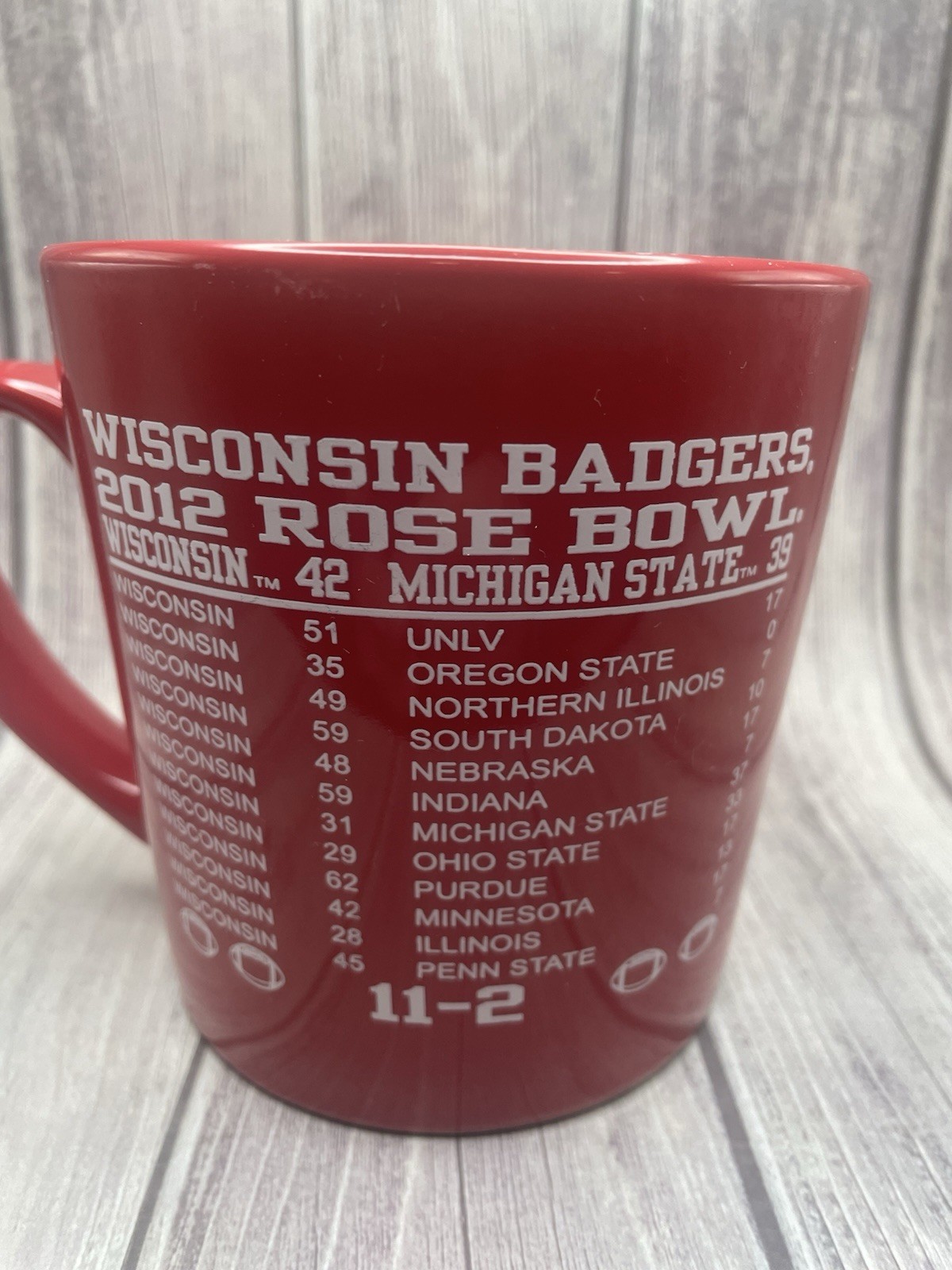 2012 Rose Bowl Football Wisconsin Badgers Red and White Coffee Mug Rare. Condition is Used. Shipped with USPS Ground Advantage.