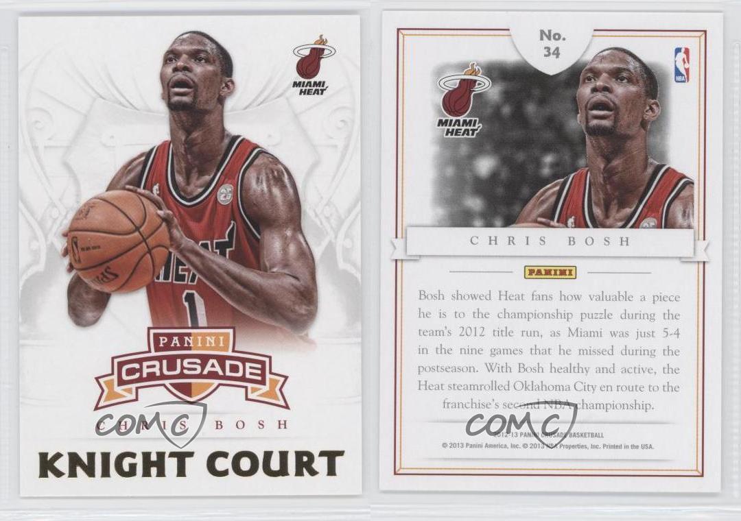 2012-13 Panini Crusade - Knight Court #34 Chris Bosh - Basketball Card - Featuring the Miami Heat - Featuring Chris Bosh Search for more: 2012-13 Panini Crusade Search for more: 2012-13 Panini Crusade - Knight Court View all of our Listings Auctions Buy It Now About Us Located in the beautiful Pacific Northwest, COMC (Check Out My Cards) is the world's largest consignment service for trading card singles. More than 10,000 people have used our consignment service to list over 50 million trading cards. Find out how we can help you consign your items on eBay by contacting us through eBay messaging. COMC -- "The Safe & Easy Way to Buy & Sell" Representative Image - Select Specific Item above to see image of actual item Representative Image - Select Specific Item above to see image of actual item Raw Condition for Modern Cards Unless otherwise noted, raw modern cards are listed in Near Mint-Mint condition or better. A NM-MT card appears to be Mint at first glance, but upon closer inspection, may exhibit some of the following: minor print defects (e.g. roller marks, print line, dimple), minor scratches, slight edge wear, and slight corner wear. Centering is clearly visible in the images provided and does not factor into our condition assessment. Raw Condition for Vintage Cards Unless otherwise noted, raw vintage cards are listed in Excellent condition or better. An EX card may exhibit some of the following: minor rounding of corners, surface wear, print defects, light scratches, and slight edge wear/chipping. Centering is clearly visible in the images provided and does not factor into our condition assessment. Domestic Shipping Combined shipping for multiple items is available. To receive combined shipping, please ensure all desired items are in your eBay shopping cart before proceeding to checkout. eBay limits orders to 40 items per order. We automatically combine multiple orders placed on the same day. If you place multiple orders on the same day, please contact us to request a refund of applicable shipping costs. Signature confirmation may be required on invoices over $400. All cards are protected and shipped securely. International Shipping COMC offers eBay's International Shipping (EIS) for international orders under $2,500* (see country exceptions below). All duties and import fees are paid at checkout; in the rare event that there are additional import fees upon delivery, these are borne by the buyer. EIS packages route through a shipping hub in Erlanger, KY before shipping to their final destination. Please note that EIS does not allow for combined shipments. The shipping rates are determined by eBay and cannot be adjusted. *Maximum sale price exceptions: Colombia, Kuwait ($2,000); Taiwan ($1,539); Chile, Costa Rica, Guatemala, Honduras, Trinidad and Tobago ($1,000); Antigua and Barbuda, Aruba, Belize, Dominica, Grenada, Philippines, Saint Kitts and Nevis, Saint Lucia, Montserrat, Turks and Caicos Islands ($500); Dominican Republic, El Salvador ($200). Please request a shipping quote through eBay messaging for orders that exceed the maximum sale price supported by eBay's International Shipping. You will be responsible for all duties and import fees for international orders shipped outside the EIS. All cards are protected and shipped securely. Payment COMC does not accept offers on our cards through our eBay storefront. COMC utilizes eBay’s managed payments system. If you are experiencing difficulties making a payment, please contact eBay for assistance. Return Policy Returns are only accepted on the rare occasion the item is not as described. If you are making a return, please initiate the return process through eBay so a mailing label can be provided for you. Prior to listing, our expert team carefully assessed this item to represent it accurately. Please review the description and high-definition images prior to purchasing to ensure this item meets your satisfaction. We welcome you to contact us if you have further questions about this item. Trust and Integrity COMC carefully assesses each item consigned to us to prevent fraudulent items from entering the marketplace. If you believe an item offered on COMC may be fraudulent, please contact us with details so we can investigate the issue. Items we determine are outside our supported items policy may be removed. Last Modified: 4/11/2025 1:42:17 PM PDT