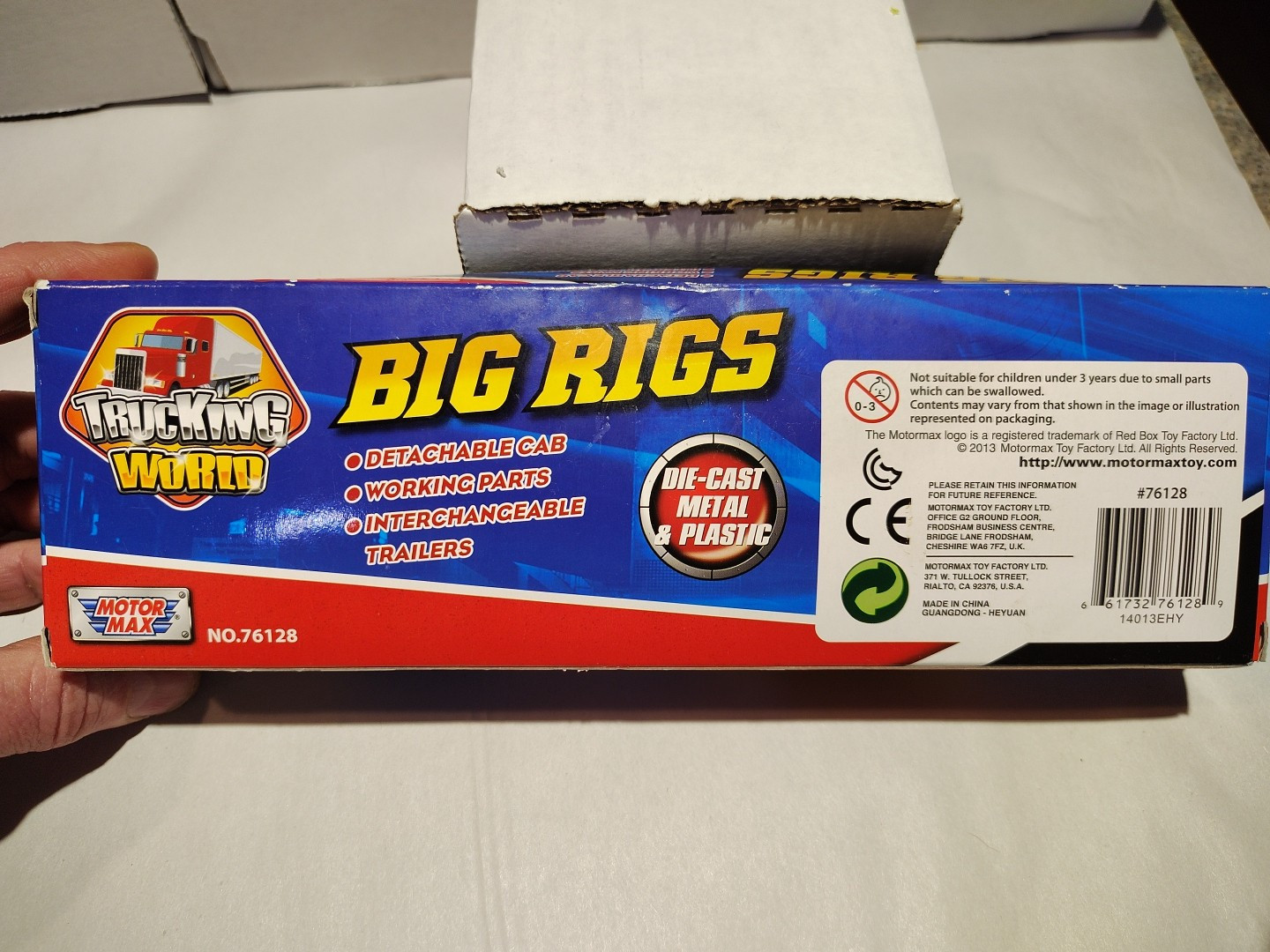 Scale:8 in - You gradeModel:UnknownGender:UnisexVehicle Type:TruckBrand:MOTORMAXCountry of Origin:ChinaRecommended Age Range:3+Vehicle Make:UnknownSeries:Big RigsColor:OrangeCharacter Family:Collectible ToysUPC:661732761289Vehicle Year:2014Material:Diecastgtin13:661732761289Year of Manufacture:2013MPN:76128Features:Advertising Specimen, Detachable Cab, Working parts, Interchangeable Trailer