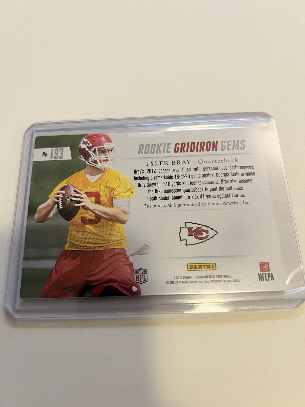 Autograph Format:Hard SignedManufacturer:PaniniCard Number:193Card Condition:Near Mint or BetterVintage:NoTeam:Kansas City ChiefsSport:FootballType:Sports Trading CardLeague:National Football League (NFL)Season:2013Autographed:YesParallel/Variety:SignaturesMaterial:Card StockFeatures:Rookie, Serial NumberedYear Manufactured:2013Graded:NoAutograph Authentication:Panini AuthenticSet:2013 Panini ProminencePlayer/Athlete:Tyler Bray