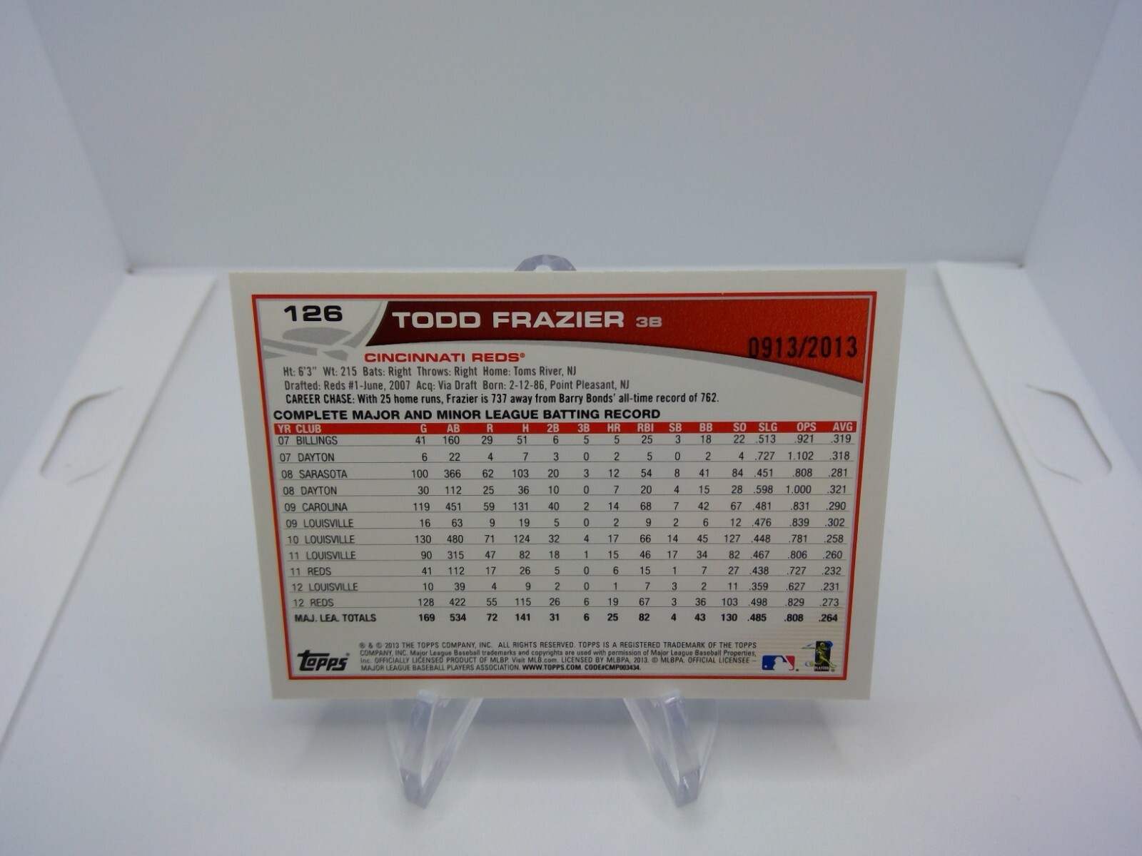 Elevate your baseball card collection with the 2013 Topps Opening Day Todd Frazier Blue All Star Rookie card. Featuring the Cincinnati Reds' standout third baseman, this limited edition card is serial numbered, marking it as a unique collectible. With its striking blue parallel design, it's a standout piece representing Frazier's impressive rookie season. Crafted by Topps, a trusted name in sports memorabilia, this card is a must-have for fans and collectors alike. It hails from the United States and is presented in English, ensuring its accessibility to a broad audience. Capture a piece of baseball history with this exceptional sports trading card. 913/2013.