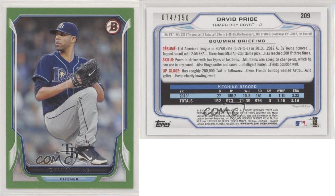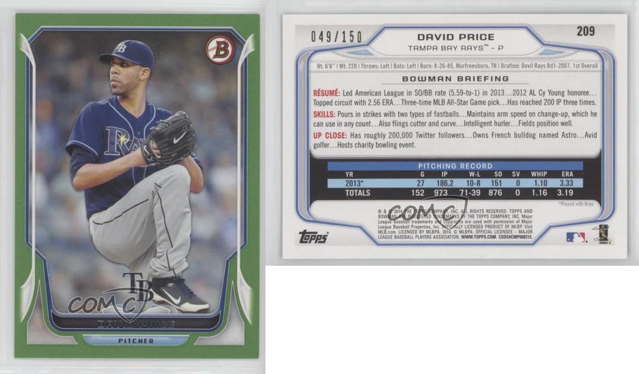 2014 Bowman - [Base] - Green #209 David Price Qty Made: 150 - Baseball Card - Featuring the Tampa Bay Rays - Featuring David Price Search for more: 2014 Bowman Search for more: 2014 Bowman - [Base] - Green View all of our Listings Auctions Buy It Now About Us Located in the beautiful Pacific Northwest, COMC (Check Out My Cards) is the world's largest consignment service for trading card singles. More than 10,000 people have used our consignment service to list over 50 million trading cards. Find out how we can help you consign your items on eBay by contacting us through eBay messaging. COMC -- "The Safe & Easy Way to Buy & Sell" Representative Image - Select Specific Item above to see image of actual item Representative Image - Select Specific Item above to see image of actual item Raw Condition for Modern Cards Unless otherwise noted, raw modern cards are listed in Near Mint-Mint condition or better. A NM-MT card appears to be Mint at first glance, but upon closer inspection, may exhibit some of the following: minor print defects (e.g. roller marks, print line, dimple), minor scratches, slight edge wear, and slight corner wear. Centering is clearly visible in the images provided and does not factor into our condition assessment. Raw Condition for Vintage Cards Unless otherwise noted, raw vintage cards are listed in Excellent condition or better. An EX card may exhibit some of the following: minor rounding of corners, surface wear, print defects, light scratches, and slight edge wear/chipping. Centering is clearly visible in the images provided and does not factor into our condition assessment. Domestic Shipping Combined shipping for multiple items is available. To receive combined shipping, please ensure all desired items are in your eBay shopping cart before proceeding to checkout. eBay limits orders to 40 items per order. We automatically combine multiple orders placed on the same day. If you place multiple orders on the same day, please contact us to request a refund of applicable shipping costs. Signature confirmation may be required on invoices over $400. All cards are protected and shipped securely. International Shipping COMC offers eBay's International Shipping (EIS) for international orders under $2,500* (see country exceptions below). All duties and import fees are paid at checkout; in the rare event that there are additional import fees upon delivery, these are borne by the buyer. EIS packages route through a shipping hub in Erlanger, KY before shipping to their final destination. Please note that EIS does not allow for combined shipments. The shipping rates are determined by eBay and cannot be adjusted. *Maximum sale price exceptions: Colombia, Kuwait ($2,000); Taiwan ($1,539); Chile, Costa Rica, Guatemala, Honduras, Trinidad and Tobago ($1,000); Antigua and Barbuda, Aruba, Belize, Dominica, Grenada, Philippines, Saint Kitts and Nevis, Saint Lucia, Montserrat, Turks and Caicos Islands ($500); Dominican Republic, El Salvador ($200). Please request a shipping quote through eBay messaging for orders that exceed the maximum sale price supported by eBay's International Shipping. You will be responsible for all duties and import fees for international orders shipped outside the EIS. All cards are protected and shipped securely. Payment COMC does not accept offers on our cards through our eBay storefront. COMC utilizes eBay’s managed payments system. If you are experiencing difficulties making a payment, please contact eBay for assistance. Return Policy Returns are only accepted on the rare occasion the item is not as described. If you are making a return, please initiate the return process through eBay so a mailing label can be provided for you. Prior to listing, our expert team carefully assessed this item to represent it accurately. Please review the description and high-definition images prior to purchasing to ensure this item meets your satisfaction. We welcome you to contact us if you have further questions about this item. Trust and Integrity COMC carefully assesses each item consigned to us to prevent fraudulent items from entering the marketplace. If you believe an item offered on COMC may be fraudulent, please contact us with details so we can investigate the issue. Items we determine are outside our supported items policy may be removed. Last Modified: 6/25/2025 2:59:59 PM PDT