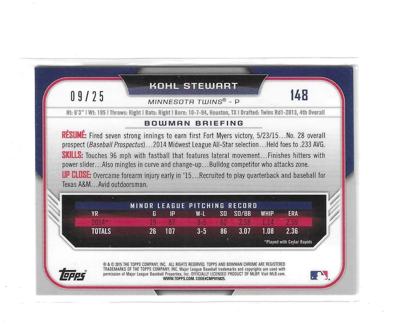you will get 2015 Bowman Draft Chrome Orange Refractor /25 Kohl Stewart #148 you get the card seen in the scan thanks