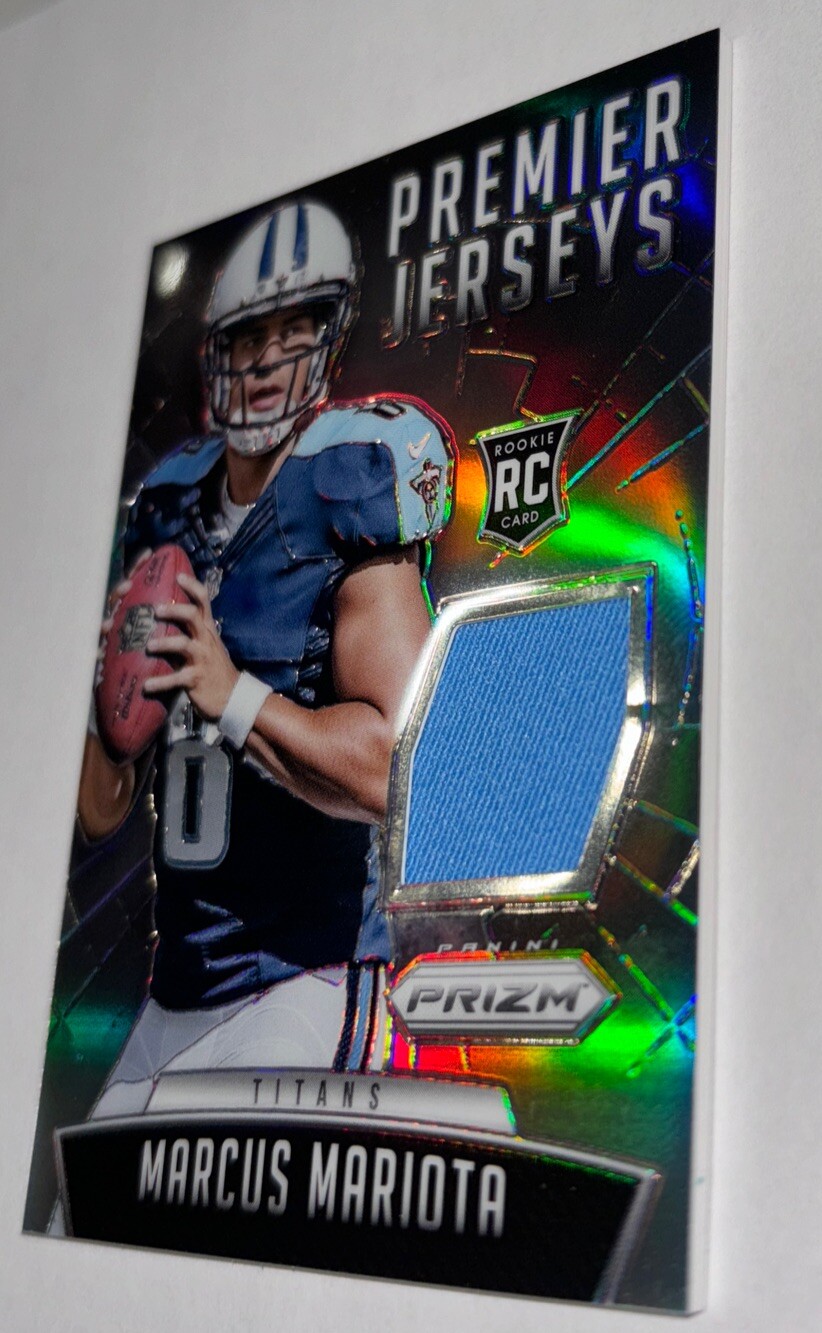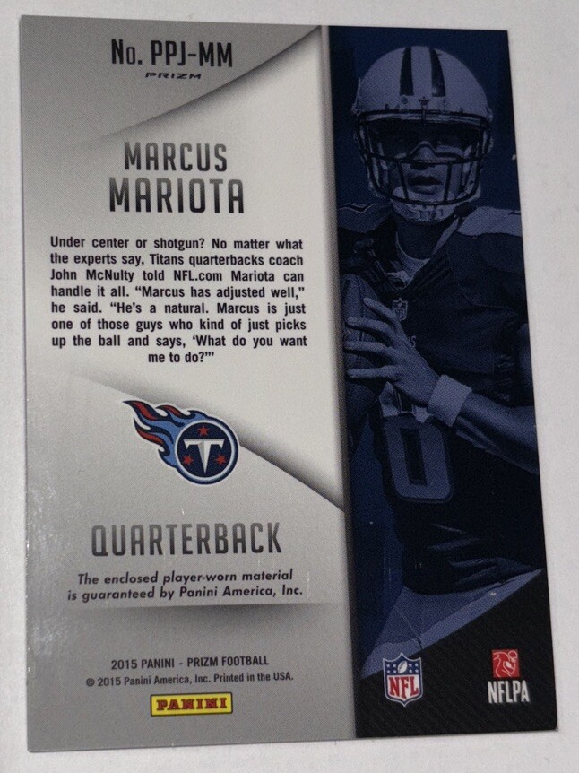 Capture a piece of football history with the 2015 Panini Prizm Premier Jerseys Marcus Mariota #PPJ-MM Rookie RC card. This memorabilia card features a swatch of the blue jersey worn by the talented quarterback during his rookie season, showcasing his early promise before he joined the NFL's Washington Commanders, Oregon Ducks, and Tennessee Titans. The card, part of the esteemed 2015 Panini Prizm - Premier Jerseys set, comes from the respected Panini America, Inc. It's a must-have for collectors who value the blend of athlete's heritage and quality craftsmanship. With its standard card size and English language, this card is a standout piece for any fan of the sport or the player's remarkable journey.