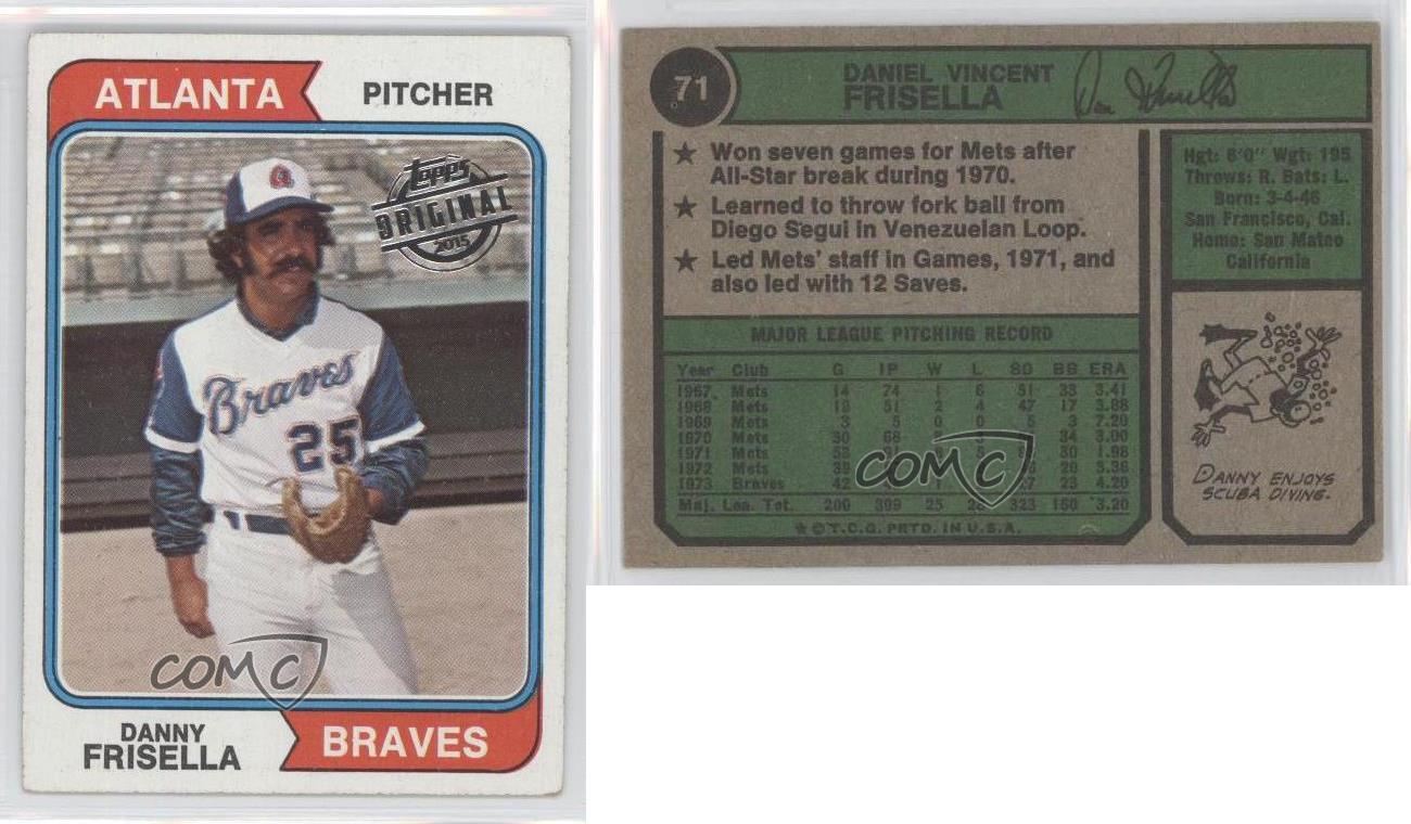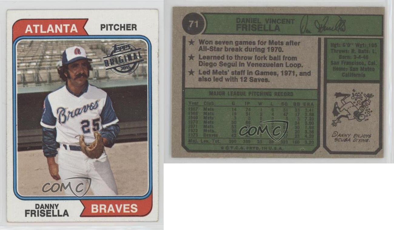 2015 Topps - Originals Buybacks #1974-71 Danny Frisella - Baseball Card - Featuring the Atlanta Braves - Featuring Danny Frisella Search for more: 2015 Topps Search for more: 2015 Topps - Originals Buybacks View all of our Listings Auctions Buy It Now About Us Located in the beautiful Pacific Northwest, COMC (Check Out My Cards) is the world's largest consignment service for trading card singles. More than 10,000 people have used our consignment service to list over 50 million trading cards. Find out how we can help you consign your items on eBay by contacting us through eBay messaging. COMC -- "The Safe & Easy Way to Buy & Sell" Representative Image - Select Specific Item above to see image of actual item Representative Image - Select Specific Item above to see image of actual item Raw Condition for Modern Cards Unless otherwise noted, raw modern cards are listed in Near Mint-Mint condition or better. A NM-MT card appears to be Mint at first glance, but upon closer inspection, may exhibit some of the following: minor print defects (e.g. roller marks, print line, dimple), minor scratches, slight edge wear, and slight corner wear. Centering is clearly visible in the images provided and does not factor into our condition assessment. Raw Condition for Vintage Cards Unless otherwise noted, raw vintage cards are listed in Excellent condition or better. An EX card may exhibit some of the following: minor rounding of corners, surface wear, print defects, light scratches, and slight edge wear/chipping. Centering is clearly visible in the images provided and does not factor into our condition assessment. Domestic Shipping Combined shipping for multiple items is available. To receive combined shipping, please ensure all desired items are in your eBay shopping cart before proceeding to checkout. eBay limits orders to 40 items per order. We automatically combine multiple orders placed on the same day. If you place multiple orders on the same day, please contact us to request a refund of applicable shipping costs. Signature confirmation may be required on invoices over $400. All cards are protected and shipped securely. International Shipping COMC offers eBay's International Shipping (EIS) for international orders under $2,500* (see country exceptions below). All duties and import fees are paid at checkout; in the rare event that there are additional import fees upon delivery, these are borne by the buyer. EIS packages route through a shipping hub in Erlanger, KY before shipping to their final destination. Please note that EIS does not allow for combined shipments. The shipping rates are determined by eBay and cannot be adjusted. *Maximum sale price exceptions: Colombia, Kuwait ($2,000); Taiwan ($1,539); Chile, Costa Rica, Guatemala, Honduras, Trinidad and Tobago ($1,000); Antigua and Barbuda, Aruba, Belize, Dominica, Grenada, Philippines, Saint Kitts and Nevis, Saint Lucia, Montserrat, Turks and Caicos Islands ($500); Dominican Republic, El Salvador ($200). Please request a shipping quote through eBay messaging for orders that exceed the maximum sale price supported by eBay's International Shipping. You will be responsible for all duties and import fees for international orders shipped outside the EIS. All cards are protected and shipped securely. Payment COMC does not accept offers on our cards through our eBay storefront. COMC utilizes eBay’s managed payments system. If you are experiencing difficulties making a payment, please contact eBay for assistance. Return Policy Returns are only accepted on the rare occasion the item is not as described. If you are making a return, please initiate the return process through eBay so a mailing label can be provided for you. Prior to listing, our expert team carefully assessed this item to represent it accurately. Please review the description and high-definition images prior to purchasing to ensure this item meets your satisfaction. We welcome you to contact us if you have further questions about this item. Trust and Integrity COMC carefully assesses each item consigned to us to prevent fraudulent items from entering the marketplace. If you believe an item offered on COMC may be fraudulent, please contact us with details so we can investigate the issue. Items we determine are outside our supported items policy may be removed. Last Modified: 5/17/2025 10:01:47 PM PDT