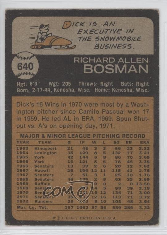 2015 Topps - Originals Buybacks #1973-640 Dick Bosman - Baseball Card - Featuring the Texas Rangers - Featuring Dick Bosman Search for more: 2015 Topps Search for more: 2015 Topps - Originals Buybacks View all of our Listings Auctions Buy It Now About Us Located in the beautiful Pacific Northwest, COMC (Check Out My Cards) is the world's largest consignment service for trading card singles. More than 10,000 people have used our consignment service to list over 50 million trading cards. Find out how we can help you consign your items on eBay by contacting us through eBay messaging. COMC -- "The Safe & Easy Way to Buy & Sell" Representative Image - Select Specific Item above to see image of actual item Representative Image - Select Specific Item above to see image of actual item Raw Condition for Modern Cards Unless otherwise noted, raw modern cards are listed in Near Mint-Mint condition or better. A NM-MT card appears to be Mint at first glance, but upon closer inspection, may exhibit some of the following: minor print defects (e.g. roller marks, print line, dimple), minor scratches, slight edge wear, and slight corner wear. Centering is clearly visible in the images provided and does not factor into our condition assessment. Raw Condition for Vintage Cards Unless otherwise noted, raw vintage cards are listed in Excellent condition or better. An EX card may exhibit some of the following: minor rounding of corners, surface wear, print defects, light scratches, and slight edge wear/chipping. Centering is clearly visible in the images provided and does not factor into our condition assessment. Domestic Shipping Combined shipping for multiple items is available. To receive combined shipping, please ensure all desired items are in your eBay shopping cart before proceeding to checkout. eBay limits orders to 40 items per order. We automatically combine multiple orders placed on the same day. If you place multiple orders on the same day, please contact us to request a refund of applicable shipping costs. Signature confirmation may be required on invoices over $400. All cards are protected and shipped securely. International Shipping COMC offers eBay's International Shipping (EIS) for international orders under $2,500* (see country exceptions below). All duties and import fees are paid at checkout; in the rare event that there are additional import fees upon delivery, these are borne by the buyer. EIS packages route through a shipping hub in Erlanger, KY before shipping to their final destination. Please note that EIS does not allow for combined shipments. The shipping rates are determined by eBay and cannot be adjusted. *Maximum sale price exceptions: Colombia, Kuwait ($2,000); Taiwan ($1,539); Chile, Costa Rica, Guatemala, Honduras, Trinidad and Tobago ($1,000); Antigua and Barbuda, Aruba, Belize, Dominica, Grenada, Philippines, Saint Kitts and Nevis, Saint Lucia, Montserrat, Turks and Caicos Islands ($500); Dominican Republic, El Salvador ($200). Please request a shipping quote through eBay messaging for orders that exceed the maximum sale price supported by eBay's International Shipping. You will be responsible for all duties and import fees for international orders shipped outside the EIS. All cards are protected and shipped securely. Payment COMC does not accept offers on our cards through our eBay storefront. COMC utilizes eBay’s managed payments system. If you are experiencing difficulties making a payment, please contact eBay for assistance. Return Policy Returns are only accepted on the rare occasion the item is not as described. If you are making a return, please initiate the return process through eBay so a mailing label can be provided for you. Prior to listing, our expert team carefully assessed this item to represent it accurately. Please review the description and high-definition images prior to purchasing to ensure this item meets your satisfaction. We welcome you to contact us if you have further questions about this item. Trust and Integrity COMC carefully assesses each item consigned to us to prevent fraudulent items from entering the marketplace. If you believe an item offered on COMC may be fraudulent, please contact us with details so we can investigate the issue. Items we determine are outside our supported items policy may be removed. Last Modified: 6/15/2025 12:18:28 AM PDT