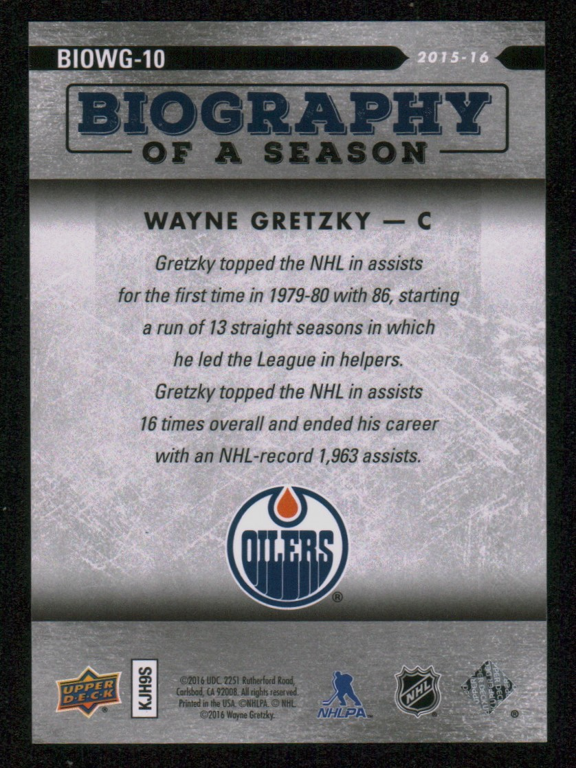 Item description : 2015-16 Upper Deck Biography of a Season #BIOWG-10 Wayne Gretzky. See photos for details. IMAGINAIRE STORE: Formerly Simon Bourque Sports Cards. Since 1988, Imaginaire specializes in trading cards, stamps, collectibles, and memorabilia . SHIPPING COSTS: Combine items and save on shipping costs. Price varies depending on the size and weight of the parcel. Shipping costs are usually between $8 to $10 for Canada, $16 for the USA, and $20 for international shipping. Please note that all packages over $100 will be automatically sent via registered postal service with tracking number. NOTICE INFORMATION: PLEASE NOTE that p ayment must be received within 7 business days of the end of auction, unless prior arrangements have been made. Item(s) will be shipped within 48 hours of the payment's reception. If you have any questions, please email us.