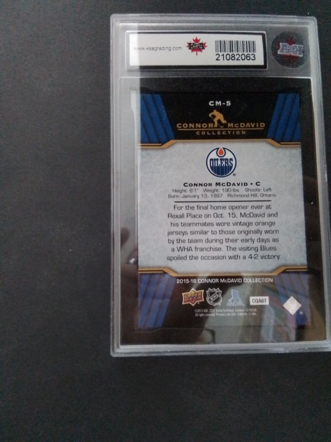 Elevate your sports card collection with the 2015-16 Upper Deck Collection Connor McDavid #CM-5 Rookie RC card. Featuring the Edmonton Oilers' phenom, this card captures McDavid in his inaugural NHL season, making it a must-have for fans and collectors alike. As part of the esteemed Upper Deck series, it showcases the quality and craftsmanship collectors have come to expect. This limited edition piece is a part of the base set and is considered a short print, adding to its rarity and value. Without an autograph, the focus remains solely on the stunning representation of a brilliant athlete during his rookie season. Cherish the beginning of what promises to be an illustrious career with this cherished slice of ice hockey history.