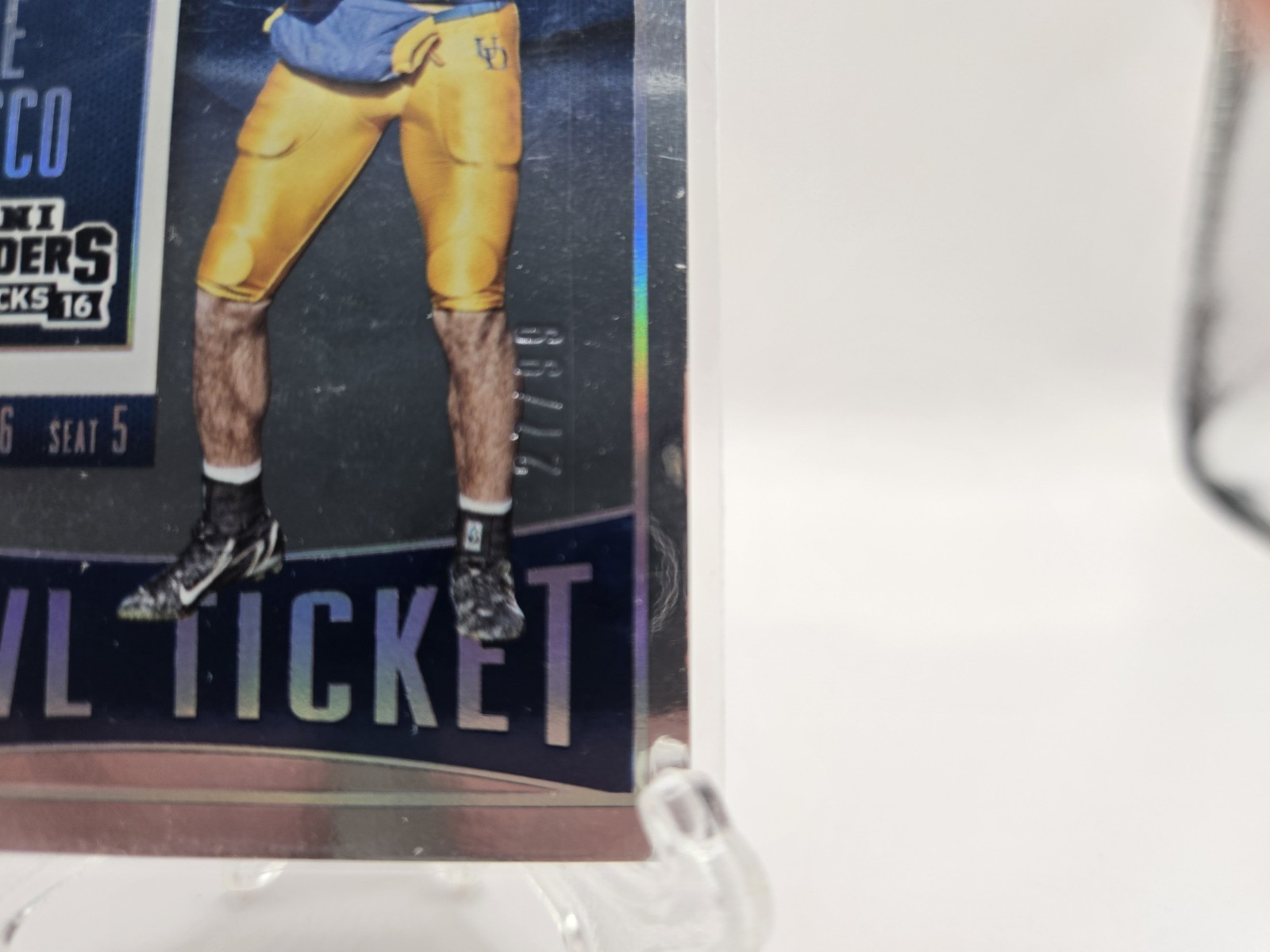 The product is a 2016 Panini Contenders Draft Picks Bowl Ticket parallel trading card featuring Joe Flacco from the University of Delaware Fightin' Blue Hens football team. The card is serial numbered out of 99 and is part of the single-parallel set. It is an original card manufactured by Panini America, Inc., with card number 51 in the 2016 season.
