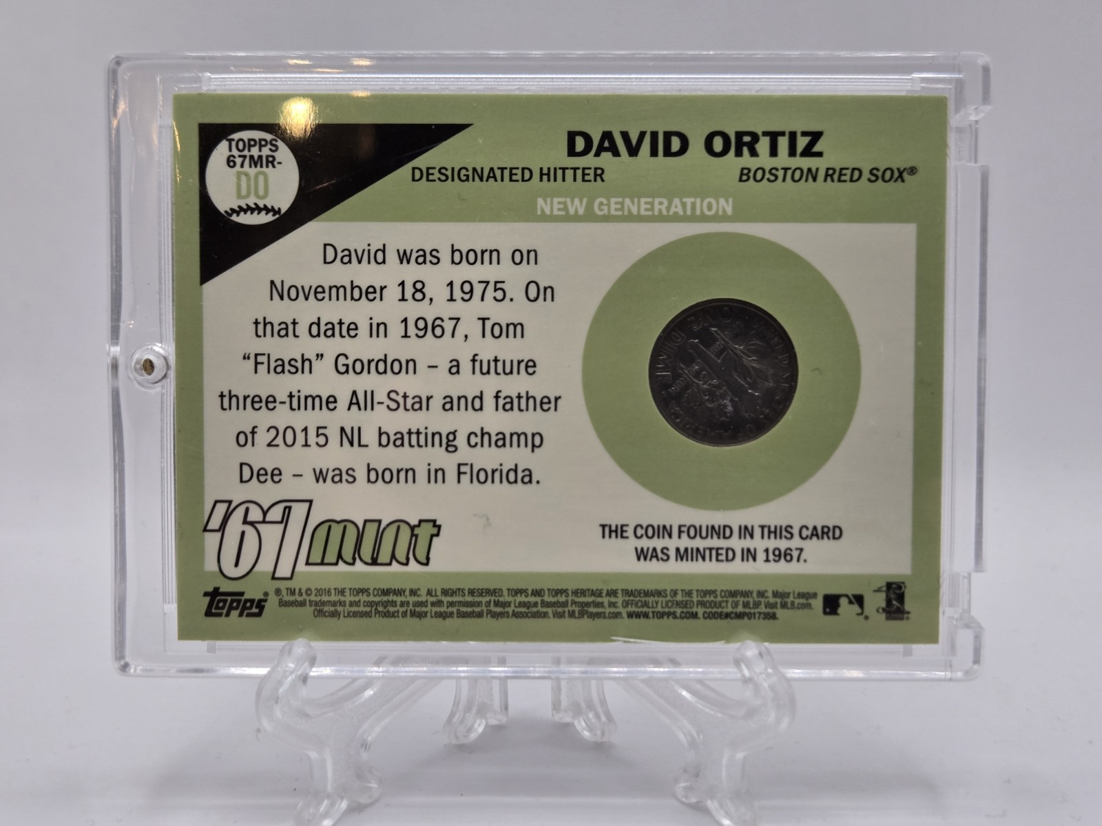 Capture a piece of baseball history with the 2016 Topps Heritage David Ortiz Mint Dime card, a sought-after collectible for any fan of the Boston Red Sox or the sport itself. This unique card celebrates the career of the iconic player, known as "Big Papi," and is a must-have for enthusiasts looking to commemorate the 2016 MLB season. With its distinctive design, this card stands out as a original piece from the reputable manufacturer Topps. Part of the exclusive 2016 Topps Heritage set, it features the player in vivid detail, making it a standout addition to any sports trading card collection.
