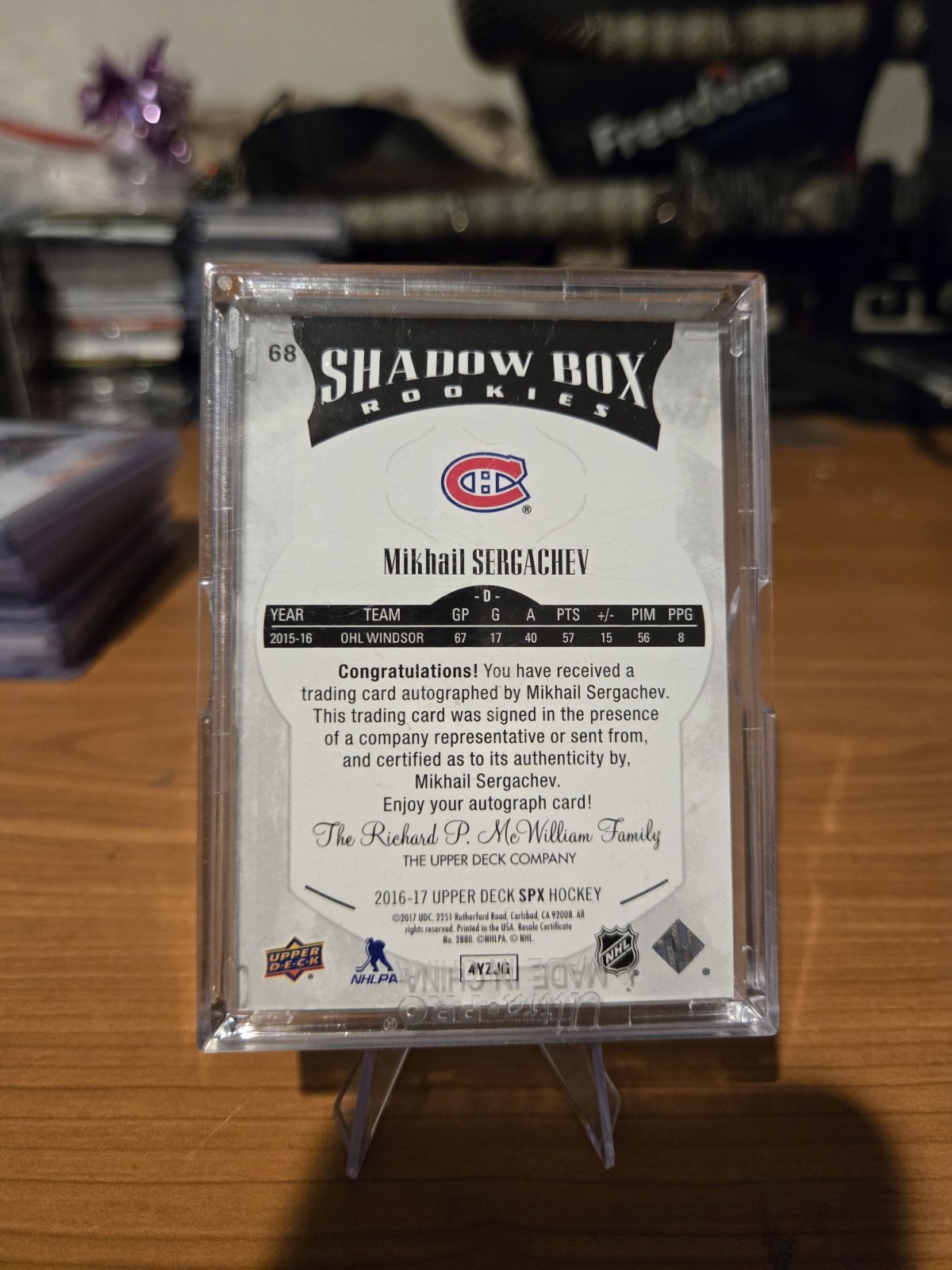 Welcome to SMYTHCARDS, I hope you enjoy the cards I am selling. My shipping costs include packaging, sleeves, cases/top loaders, and tracking (where applicable). I am willing to negotiate, but that will entail you forgoing tracking and any losses in shipping due to that. Higher end cards will always include tracking. Apologies that it is non-negotiable. You have the option to pick a tracked order or lettermail; any losses due to an untracked order will be on you as the buyer. Any additional cards won will be $1 added to your order. Any Lots won will be $2-5 additional per, depending on the size of the lot won. Elevate your collection with the 2016-17 SPx Mikhail Sergachev Shadow Box Rookie Auto card, limited to just 199 prints. A standout piece for any fan, it features the highly touted defenseman in his inaugural season, split between the Montreal Canadiens and New York Islanders. The blue parallel variety adds an exclusive touch, while the hard-signed autograph by Sergachev himself is authenticated by Upper Deck, ensuring its legitimacy and value. Not only is this card serial numbered for rarity, but it also boasts a sleek design that captures the essence of the NHL's exciting atmosphere. Whether you're a dedicated collector of Ice Hockey memorabilia or seeking to commemorate a player's early career, this card delivers on both fronts. Note that this card is a must-have for enthusiasts of the sport, capturing the spirit of the game and its rising stars.