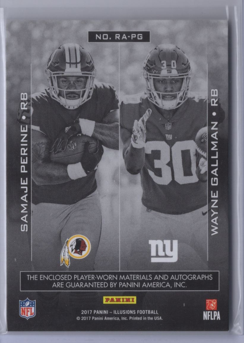 About Me Other Listings Feedback Add to Favorites Contact Me eBay Store Striking Cards 901 2017 Panini Illusions Rookie Reflection Dual Samaje Perine / Wayne Gallman No stock photo / These are real scans or pictures Details Description: Samaje Perine / Wayne Gallman Category: Football Year: 2017 Product: Panini Illusions Rookie Reflection Dual Team: Washington Redskins / New York Giants Card Number: RA-PG Hand Signed: Yes Rookie: Yes Memorabilia: Player-Worn Serial Number: 03/15 Dimensions: 3¾" x 2½" SKU: FT B0001 R01 F (249) Listing By Kronocard trading cards software v2.7.0.1