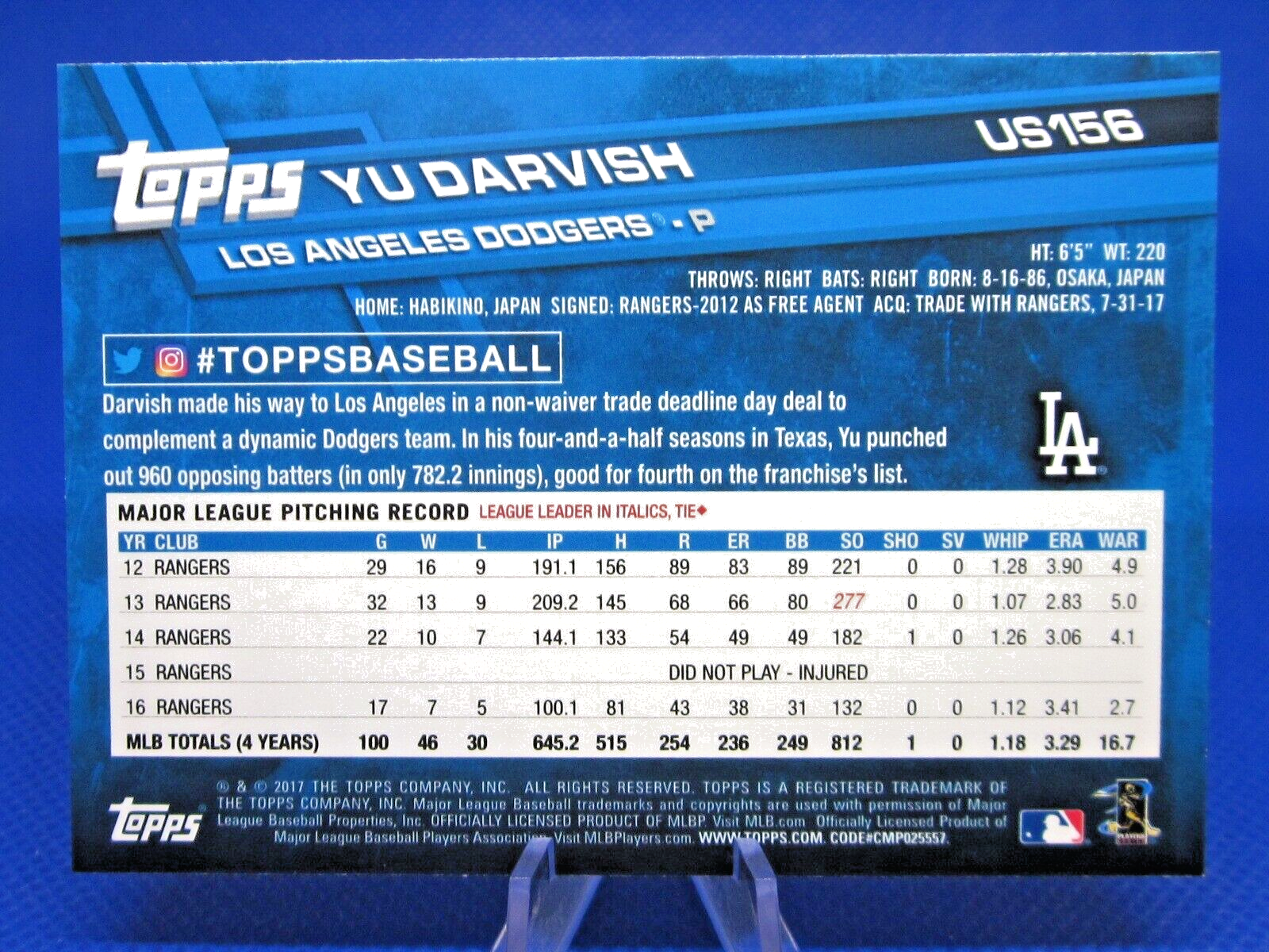 Here I have a 2017 Topps Update Series Short print card of Yu Darvish. This card is number US156. I have a lot of short print and parallel cards from different years and different series listed. Please check them out. I offer free shipping on all my items. Your card will be shipped in a semi rigid top loader inside a plain white envelope. With a tracking number provided. Any orders that total over $20 will be shipped in a bubble mailer with a tracking number. If buying more than one card please add all cards to your cart and pay for all at one time. I have been with Ebay since 2002 and have maintained a 100 percent positive feedback throughout. So buy from a trusted seller. Please feel free to ask any questions.
