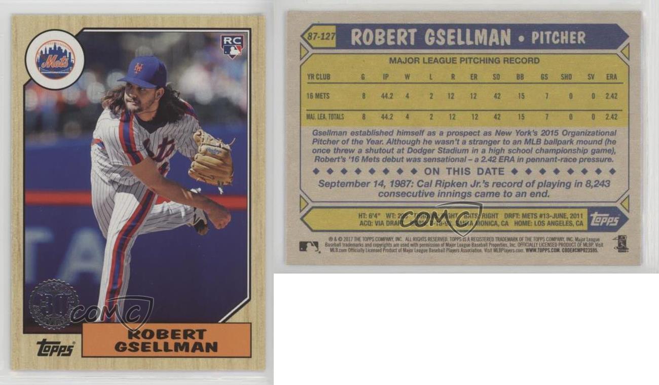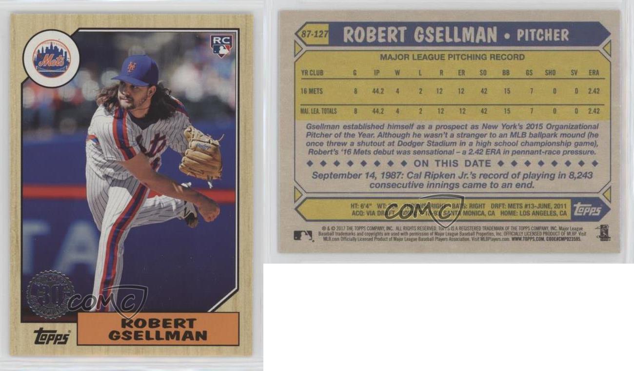 2017 Topps - 1987 Topps Baseball 30th Anniversary #87-127 Robert Gsellman - Rookie - Baseball Card - Featuring the New York Mets - Featuring Robert Gsellman Search for more: 2017 Topps Search for more: 2017 Topps - 1987 Topps Baseball 30th Anniversary View all of our Listings Auctions Buy It Now About Us Located in the beautiful Pacific Northwest, COMC (Check Out My Cards) is the world's largest consignment service for trading card singles. More than 10,000 people have used our consignment service to list over 50 million trading cards. Find out how we can help you consign your items on eBay by contacting us through eBay messaging. COMC -- "The Safe & Easy Way to Buy & Sell" Representative Image - Select Specific Item above to see image of actual item Representative Image - Select Specific Item above to see image of actual item Raw Condition for Modern Cards Unless otherwise noted, raw modern cards are listed in Near Mint-Mint condition or better. A NM-MT card appears to be Mint at first glance, but upon closer inspection, may exhibit some of the following: minor print defects (e.g. roller marks, print line, dimple), minor scratches, slight edge wear, and slight corner wear. Centering is clearly visible in the images provided and does not factor into our condition assessment. Raw Condition for Vintage Cards Unless otherwise noted, raw vintage cards are listed in Excellent condition or better. An EX card may exhibit some of the following: minor rounding of corners, surface wear, print defects, light scratches, and slight edge wear/chipping. Centering is clearly visible in the images provided and does not factor into our condition assessment. Domestic Shipping Combined shipping for multiple items is available. To receive combined shipping, please ensure all desired items are in your eBay shopping cart before proceeding to checkout. eBay limits orders to 40 items per order. We automatically combine multiple orders placed on the same day. If you place multiple orders on the same day, please contact us to request a refund of applicable shipping costs. Signature confirmation may be required on invoices over $400. All cards are protected and shipped securely. International Shipping COMC offers eBay's International Shipping (EIS) for international orders under $2,500* (see country exceptions below). All duties and import fees are paid at checkout; in the rare event that there are additional import fees upon delivery, these are borne by the buyer. EIS packages route through a shipping hub in Erlanger, KY before shipping to their final destination. Please note that EIS does not allow for combined shipments. The shipping rates are determined by eBay and cannot be adjusted. *Maximum sale price exceptions: Colombia, Kuwait ($2,000); Taiwan ($1,539); Chile, Costa Rica, Guatemala, Honduras, Trinidad and Tobago ($1,000); Antigua and Barbuda, Aruba, Belize, Dominica, Grenada, Philippines, Saint Kitts and Nevis, Saint Lucia, Montserrat, Turks and Caicos Islands ($500); Dominican Republic, El Salvador ($200). Please request a shipping quote through eBay messaging for orders that exceed the maximum sale price supported by eBay's International Shipping. You will be responsible for all duties and import fees for international orders shipped outside the EIS. All cards are protected and shipped securely. Payment COMC does not accept offers on our cards through our eBay storefront. COMC utilizes eBay’s managed payments system. If you are experiencing difficulties making a payment, please contact eBay for assistance. Return Policy Returns are only accepted on the rare occasion the item is not as described. If you are making a return, please initiate the return process through eBay so a mailing label can be provided for you. Prior to listing, our expert team carefully assessed this item to represent it accurately. Please review the description and high-definition images prior to purchasing to ensure this item meets your satisfaction. We welcome you to contact us if you have further questions about this item. Trust and Integrity COMC carefully assesses each item consigned to us to prevent fraudulent items from entering the marketplace. If you believe an item offered on COMC may be fraudulent, please contact us with details so we can investigate the issue. Items we determine are outside our supported items policy may be removed. Last Modified: 6/17/2025 11:47:49 PM PDT