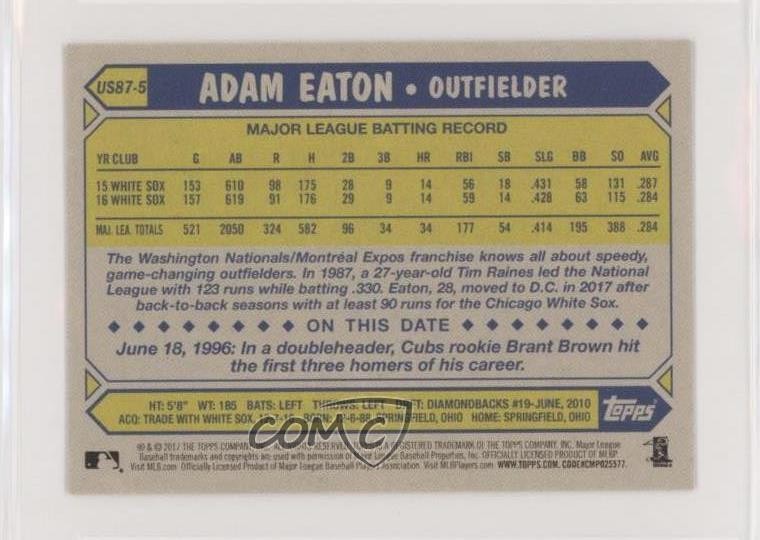 2017 Topps Mini - Update Series 1987 Design #US87-5 Adam Eaton - Baseball Card - Featuring the Washington Nationals - Featuring Adam Eaton Search for more: 2017 Topps Mini Search for more: 2017 Topps Mini - Update Series 1987 Design View all of our Listings Auctions Buy It Now About Us Located in the beautiful Pacific Northwest, COMC (Check Out My Cards) is the world's largest consignment service for trading card singles. More than 10,000 people have used our consignment service to list over 50 million trading cards. Find out how we can help you consign your items on eBay by contacting us through eBay messaging. COMC -- "The Safe & Easy Way to Buy & Sell" Representative Image - Select Specific Item above to see image of actual item Representative Image - Select Specific Item above to see image of actual item Raw Condition for Modern Cards Unless otherwise noted, raw modern cards are listed in Near Mint-Mint condition or better. A NM-MT card appears to be Mint at first glance, but upon closer inspection, may exhibit some of the following: minor print defects (e.g. roller marks, print line, dimple), minor scratches, slight edge wear, and slight corner wear. Centering is clearly visible in the images provided and does not factor into our condition assessment. Raw Condition for Vintage Cards Unless otherwise noted, raw vintage cards are listed in Excellent condition or better. An EX card may exhibit some of the following: minor rounding of corners, surface wear, print defects, light scratches, and slight edge wear/chipping. Centering is clearly visible in the images provided and does not factor into our condition assessment. Domestic Shipping Combined shipping for multiple items is available. To receive combined shipping, please ensure all desired items are in your eBay shopping cart before proceeding to checkout. eBay limits orders to 40 items per order. We automatically combine multiple orders placed on the same day. If you place multiple orders on the same day, please contact us to request a refund of applicable shipping costs. Signature confirmation may be required on invoices over $400. All cards are protected and shipped securely. International Shipping COMC offers eBay's International Shipping (EIS) for international orders under $2,500* (see country exceptions below). All duties and import fees are paid at checkout; in the rare event that there are additional import fees upon delivery, these are borne by the buyer. EIS packages route through a shipping hub in Erlanger, KY before shipping to their final destination. Please note that EIS does not allow for combined shipments. The shipping rates are determined by eBay and cannot be adjusted. *Maximum sale price exceptions: Colombia, Kuwait ($2,000); Taiwan ($1,539); Chile, Costa Rica, Guatemala, Honduras, Trinidad and Tobago ($1,000); Antigua and Barbuda, Aruba, Belize, Dominica, Grenada, Philippines, Saint Kitts and Nevis, Saint Lucia, Montserrat, Turks and Caicos Islands ($500); Dominican Republic, El Salvador ($200). Please request a shipping quote through eBay messaging for orders that exceed the maximum sale price supported by eBay's International Shipping. You will be responsible for all duties and import fees for international orders shipped outside the EIS. All cards are protected and shipped securely. Payment COMC does not accept offers on our cards through our eBay storefront. COMC utilizes eBay’s managed payments system. If you are experiencing difficulties making a payment, please contact eBay for assistance. Return Policy Returns are only accepted on the rare occasion the item is not as described. If you are making a return, please initiate the return process through eBay so a mailing label can be provided for you. Prior to listing, our expert team carefully assessed this item to represent it accurately. Please review the description and high-definition images prior to purchasing to ensure this item meets your satisfaction. We welcome you to contact us if you have further questions about this item. Trust and Integrity COMC carefully assesses each item consigned to us to prevent fraudulent items from entering the marketplace. If you believe an item offered on COMC may be fraudulent, please contact us with details so we can investigate the issue. Items we determine are outside our supported items policy may be removed. Last Modified: 6/14/2025 3:34:09 AM PDT
